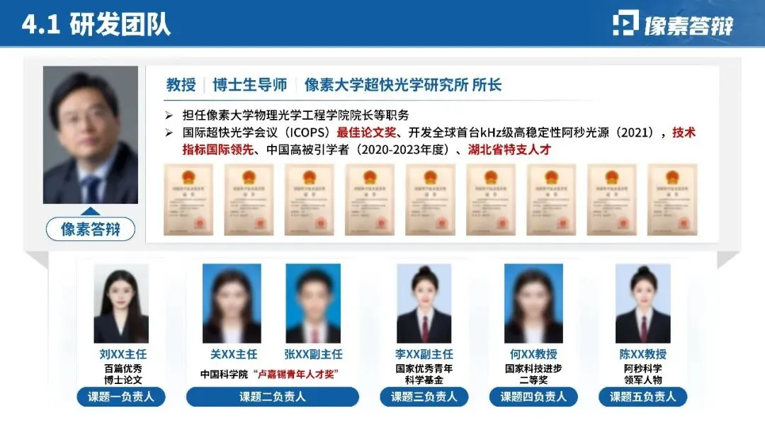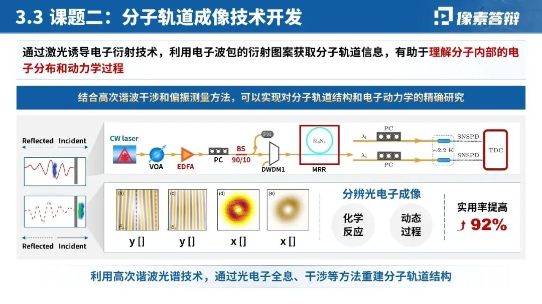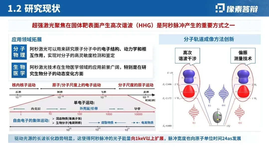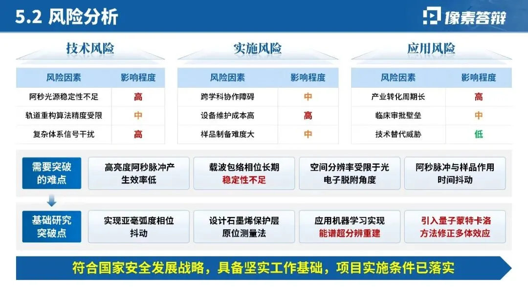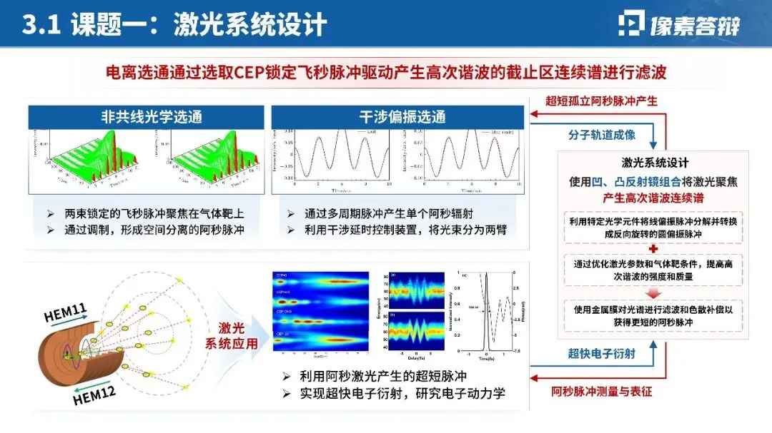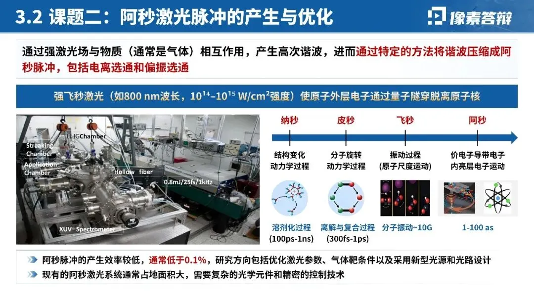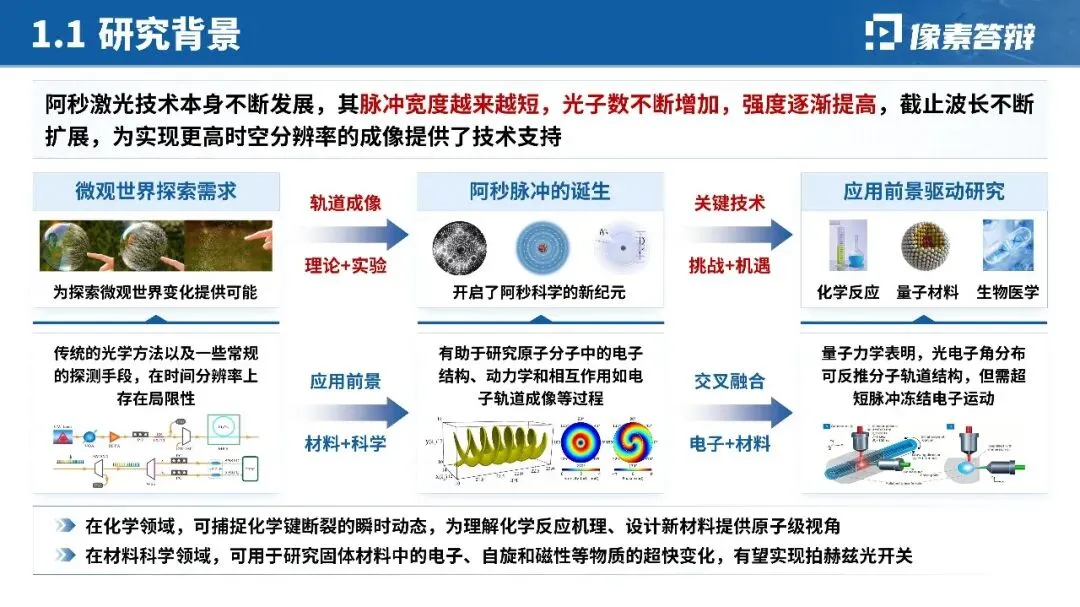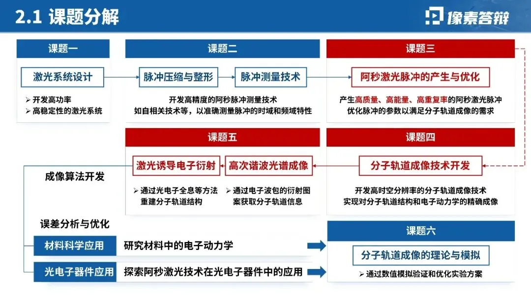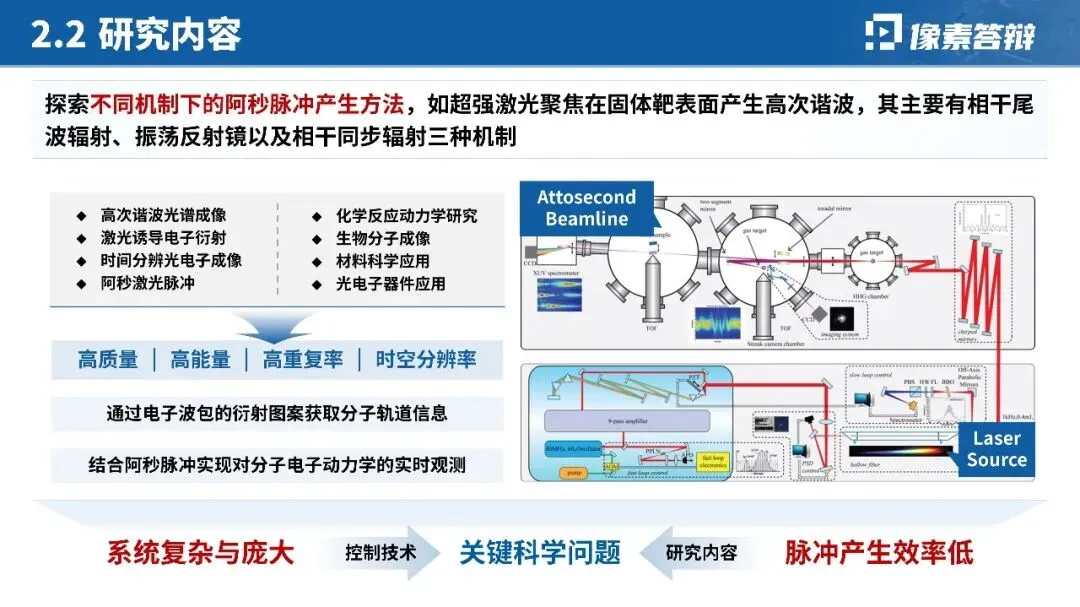 针对阿秒激光脉冲产生、分子轨道成像等硬核技术,摒弃大段公式与文字,优先用「时间尺度对比图」「光路设计示意图」「实验装置图」呈现核心原理;对关键数据(如脉宽 < 200as、亮度提升 10 倍)用图表突出,技术难点与突破点一一对应,降低跨学科评审的理解门槛。