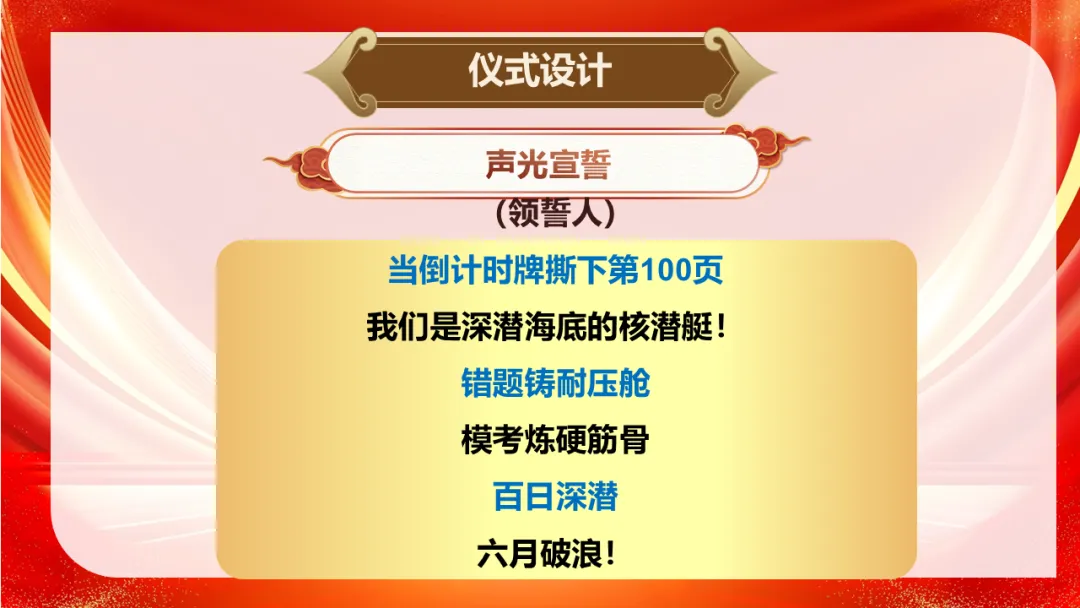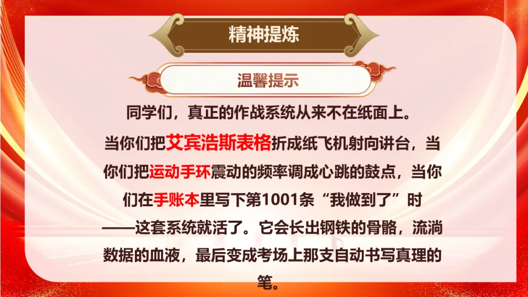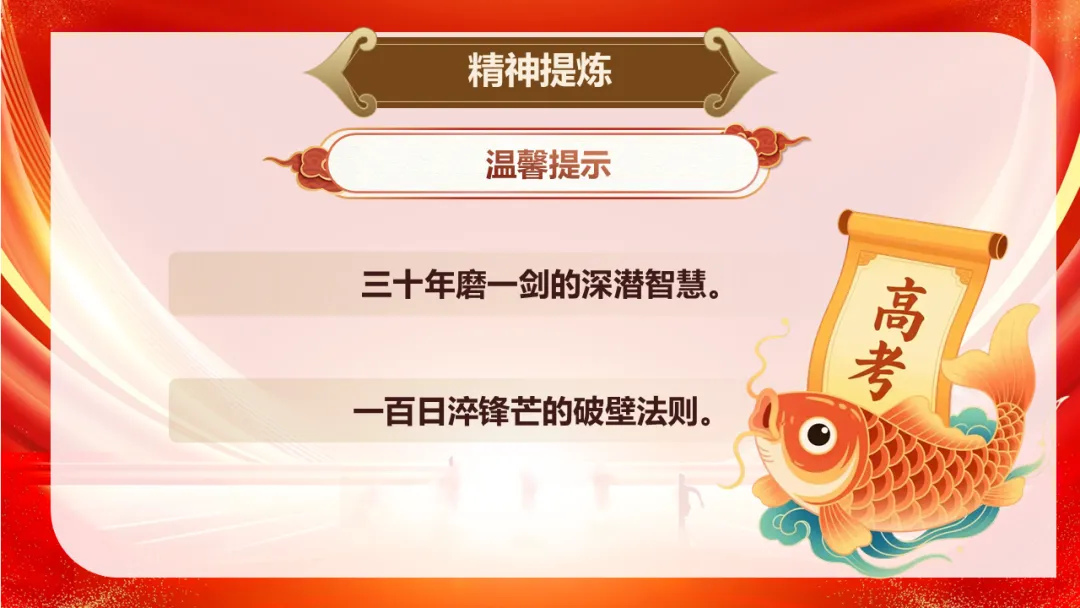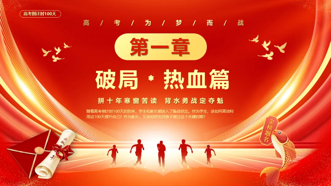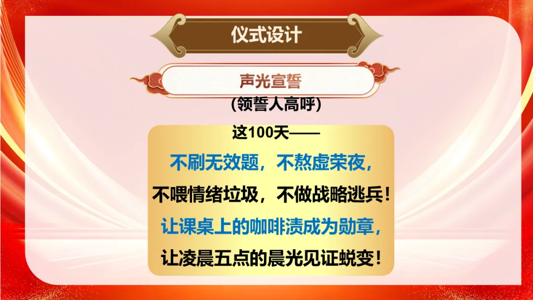 本期给大家分享的是高考百日冲刺主题系列ppt课件,作为高三阶段最具仪式感的关键节点,将抽象的时间压力转化为可视目标,将个体焦虑升华为集体信念,同时提供可执行的复习策略。