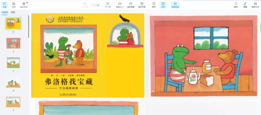 绘本阅读是幼儿教育的重要方式,但许多家长因孩子不识字或价格高而忽视其价值。实际上,绘本通过图文结合能同时刺激儿童的视觉和语言发展。优质绘本能提升儿童的认知、语言和社交能力。长期阅读对学业发展和亲子关系都有积极影响。绘本既是学习工具,也是亲子互动的桥梁。绘本PPT通过丰富多彩的故事和生动的画面,激发幼儿园儿童的学习兴趣,培养他们的阅读能力、想象力和创造力。 绘本PPT电子版画册涵盖了各种主题和风格,包括寓言故事、科普知识、生活常识、人际交往等方面,满足不同年龄段儿童的阅读需求。这些绘本不仅具有丰富的故事情节和精美的插图,还注重文字表达简洁易懂,适合幼儿园儿童阅读和理解。故事讲述的是青蛙弗洛格和小熊一起去挖宝藏,他们想挖一个地洞,一直挖一直挖,直到找到宝藏为止。可是他们被困在地洞里出不了了,这可怎么办呢?