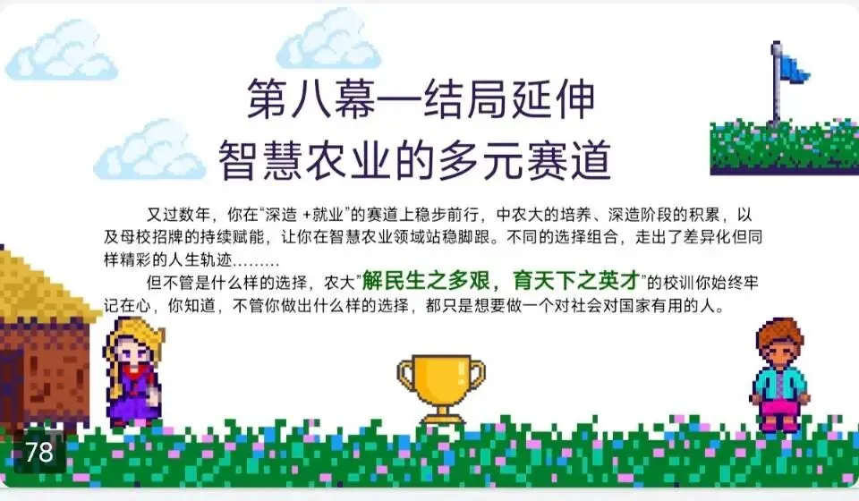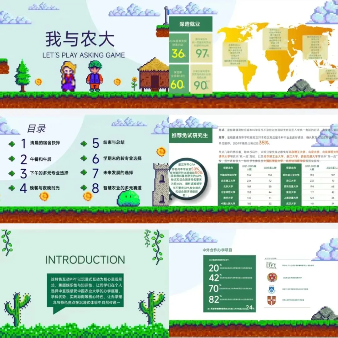 在PPT内容设计上,我们摒弃冗长的文字堆砌,采用“场景化+互动化”双重模式:以“高中学子变身农大学生”为核心主线,串联起农大衣食住行、学科优势、奖助政策等所有核心内容。不同于传统PPT的静态展示,这套互动PPT设置了“彩蛋触发”等特色环节。