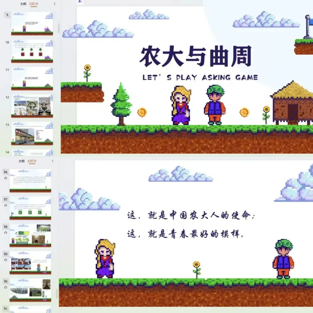 一场有记忆点的宣讲,始于对细节的极致打磨;而本次宣讲的灵魂,便是这套沉浸式互动PPT。为了打破“学长讲、学弟听”的枯燥模式,让高中学子真正“走进”农大。筹备阶段,14位同学联合发力,将PPT打造成“沉浸式农大体验手册”,每一个环节都围绕“互动”设计,每一处细节都贴合高中学子的好奇点。