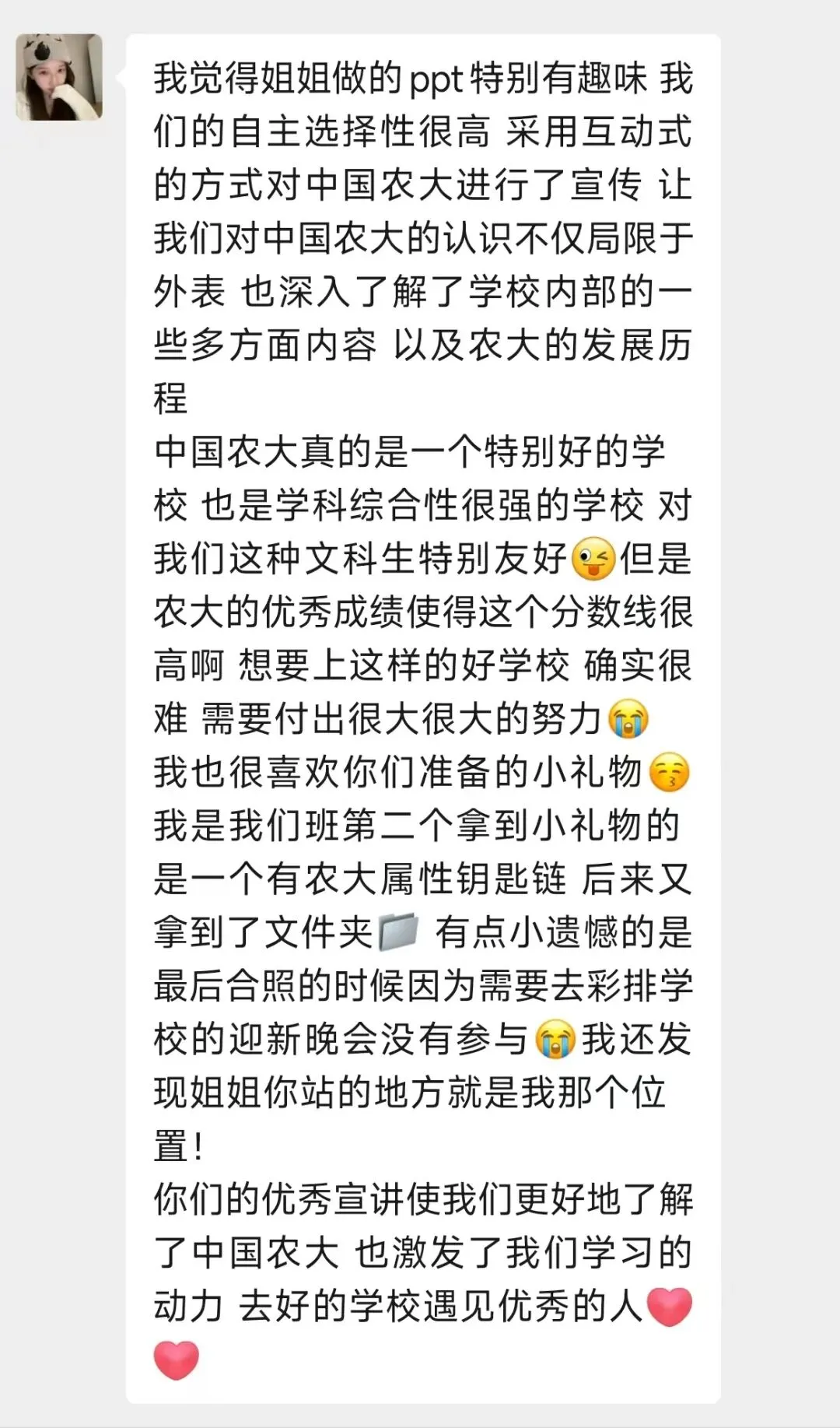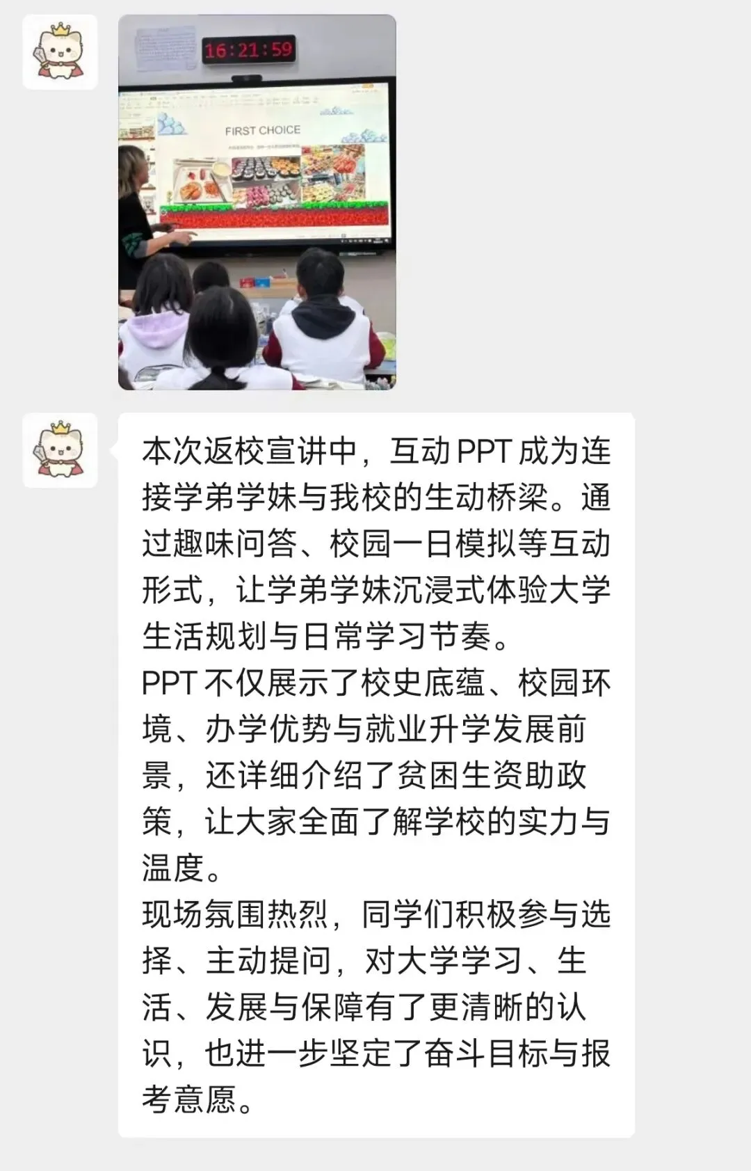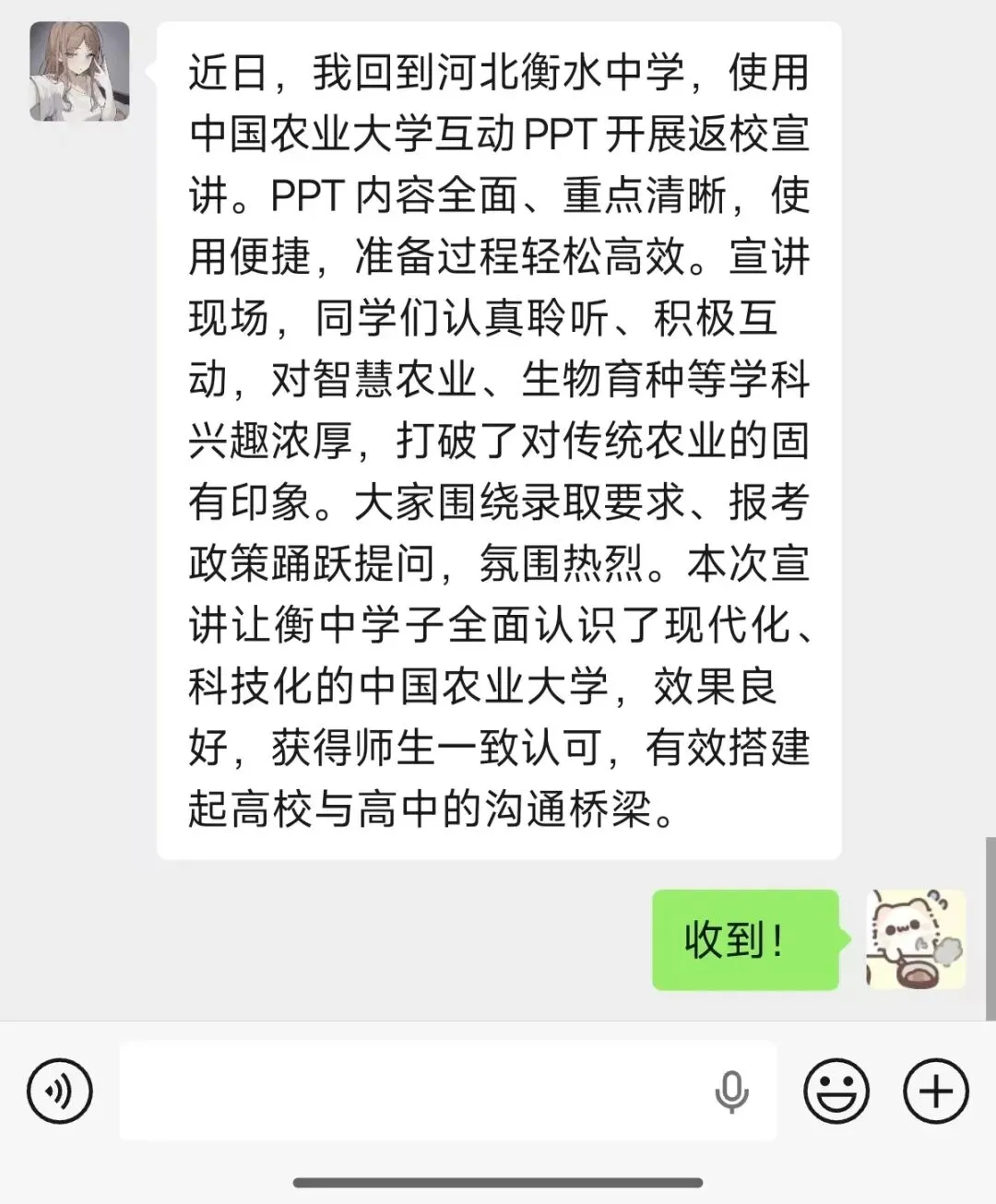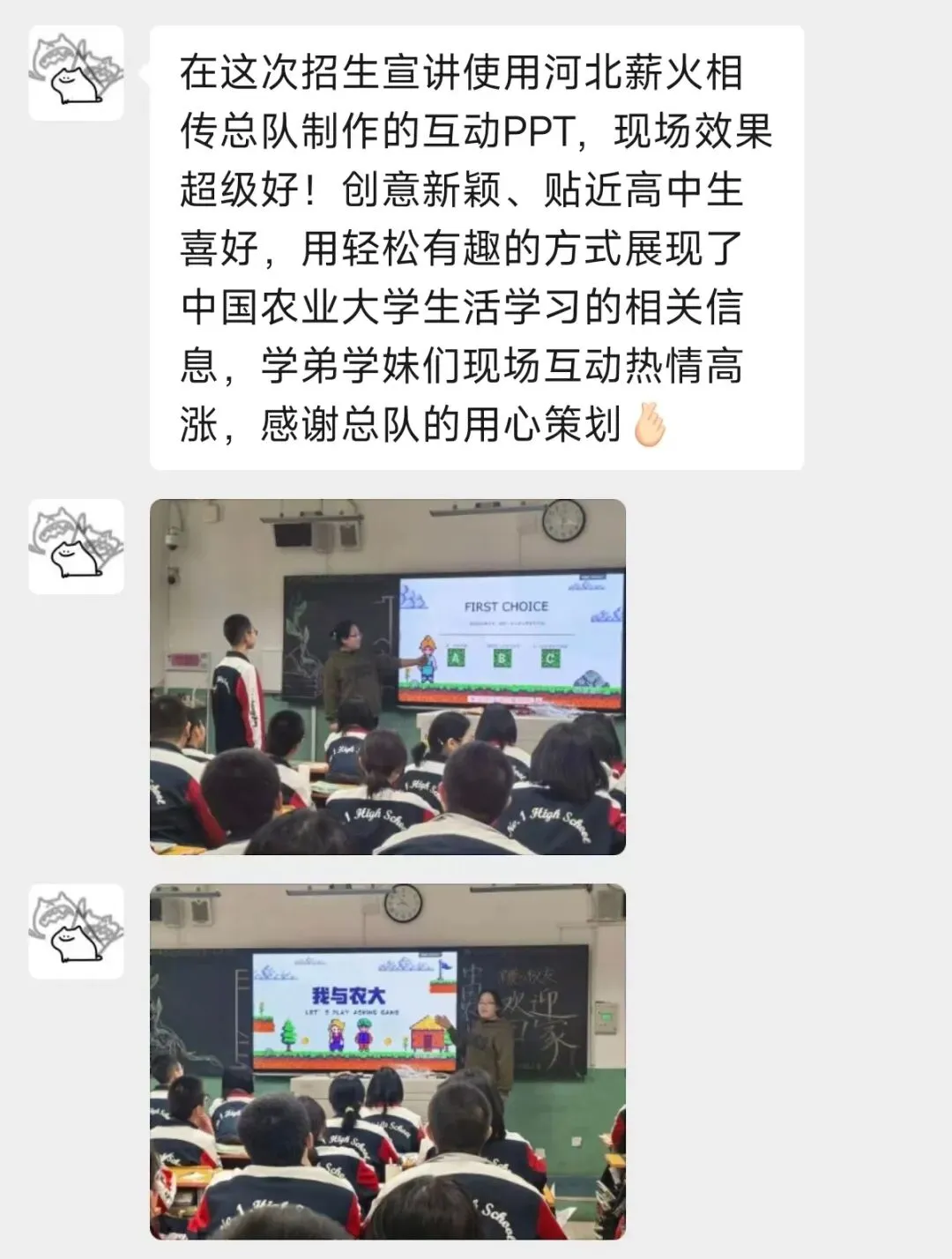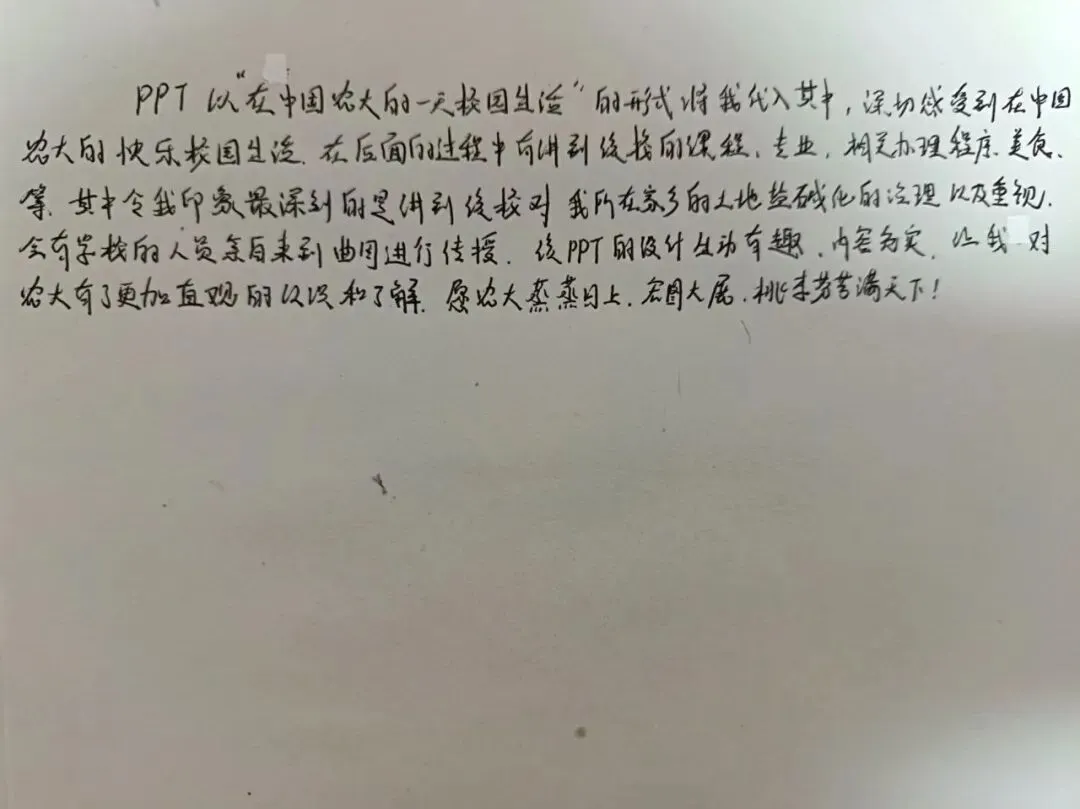 宣讲结束后,不少高中学子主动分享自己的感受,大家纷纷表示,这套互动PPT让他们对农大的认知更直观、更深刻,也让宣讲变得格外有意义。
