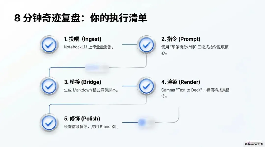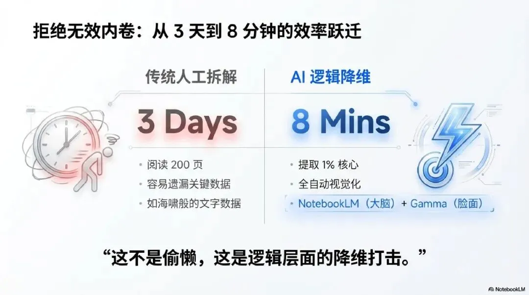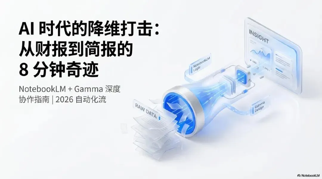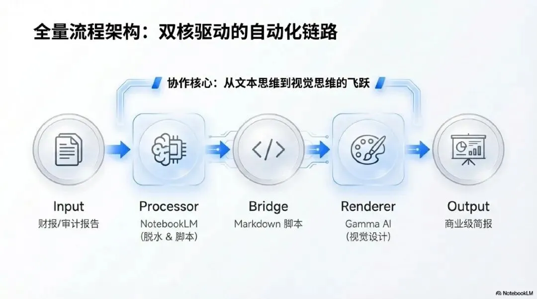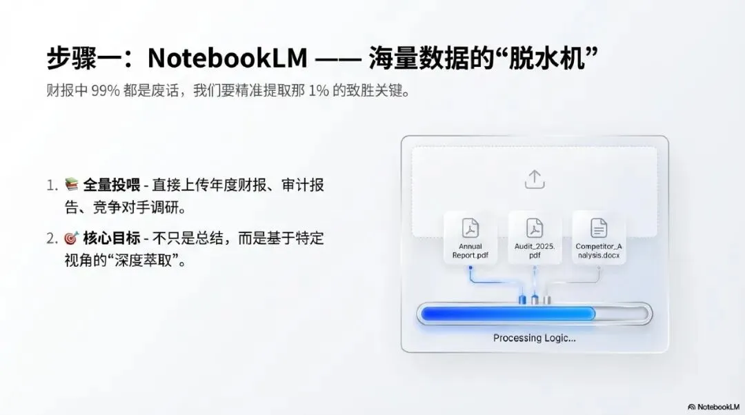 NotebookLM 在流程中扮演资深分析师的角色,专注于对海量原始素材进行深度处理