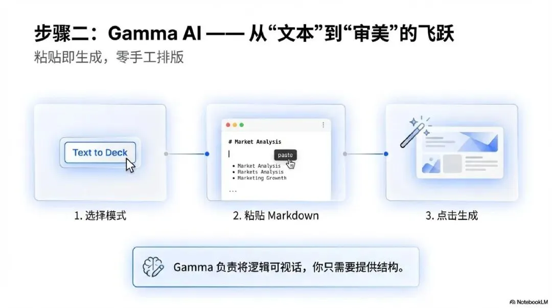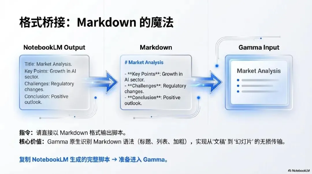 在利用 Gamma 的“文本转幻灯片”(Text to Deck)功能将 NotebookLM 生成的内容转化为演示文稿时,Markdown 格式不仅是输入的基础,更是确保 AI 能够正确识别幻灯片层级、内容逻辑及视觉意图的核心准则。