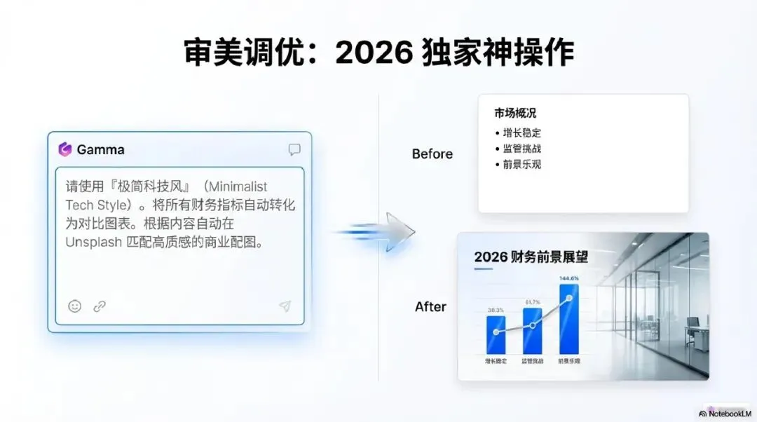 • 视觉建议 (Visual Design): 需使用文字描述该页面应匹配的图表类型(如瀑布图、对比条形图)或商业场景配图。这些描述是 Gamma 自动生成图表和匹配 Unsplash 高质量图片的依据,。