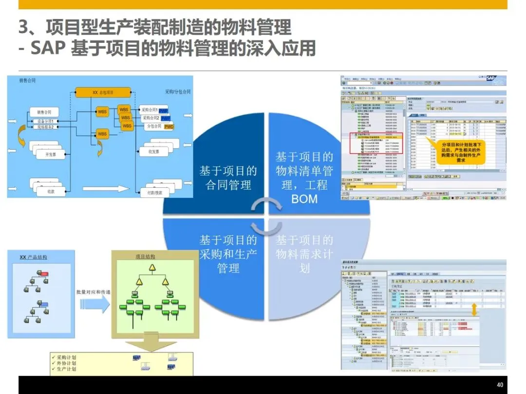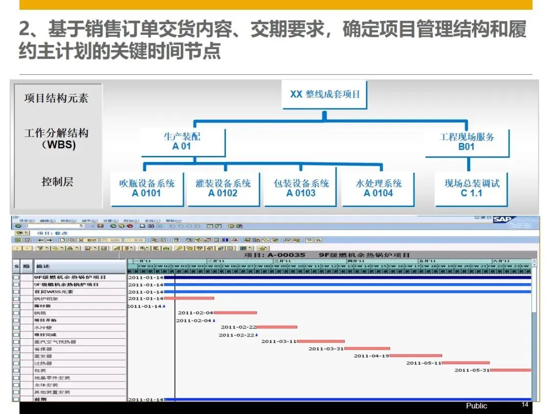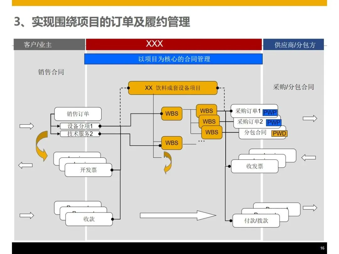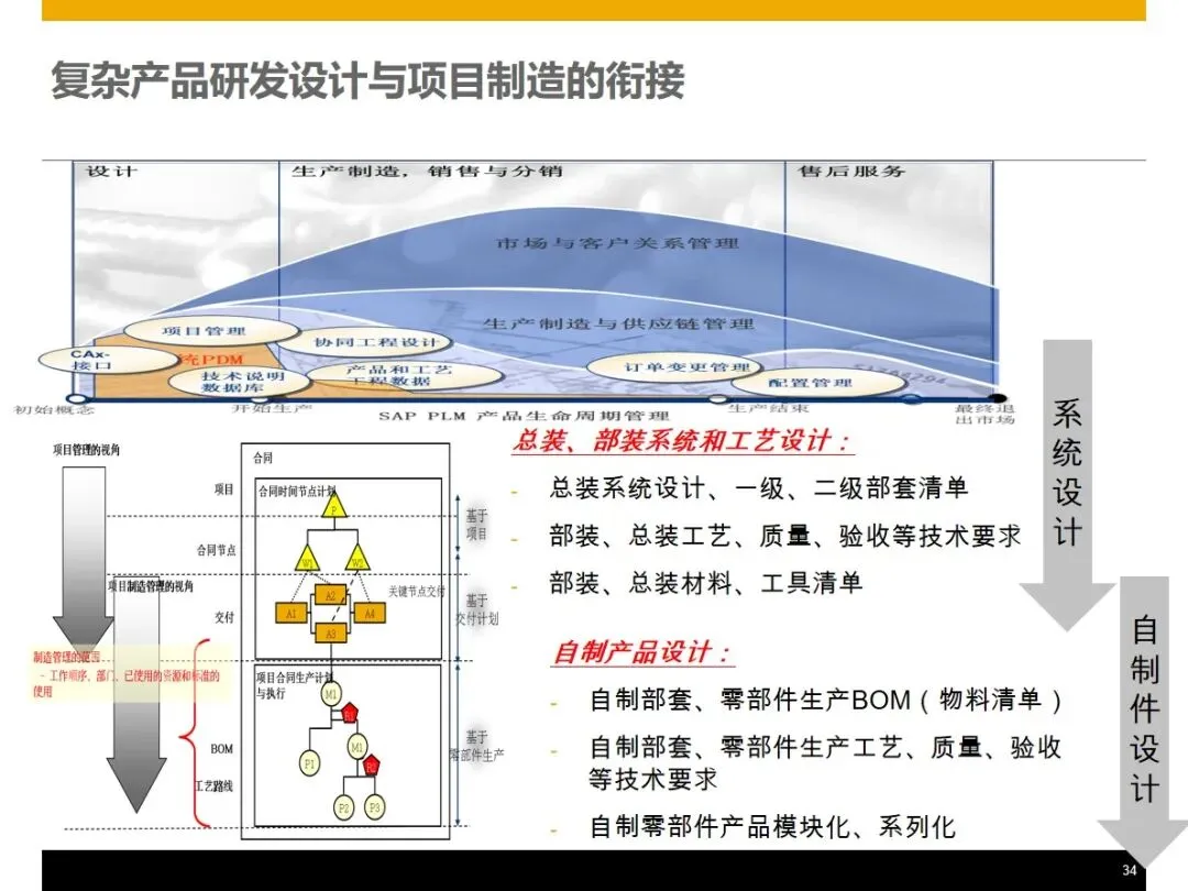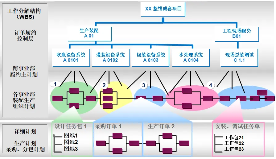 该方案基于WBS的工作分解架构,将订单管理,产品设计,生产组装,采购供应,仓储物流,现场服务,财务管理等核心业务模块进行整合,实现了企业的信息流,物流和资金流的“三流”整合,并在此基础上提出了基于 WBS工作分解架构的客户关系管理系统,实现了基于 WBS的客户关系管理系统的客户关系管理。在销售方面,能够完成产品组合配置、定价、里程碑开票、资金回收追踪等功能,并能按照项目进度自动生成资金回收计划,对客户的信用评价和风险控制同步进行;在设计阶段, PLM和 ERP系统的集成使得 CAD BOM的快速导入和基础 BOM、变化 BOM和项目 BOM的柔性调节成为可能,从而实现了对客户个性化需求的精确匹配。