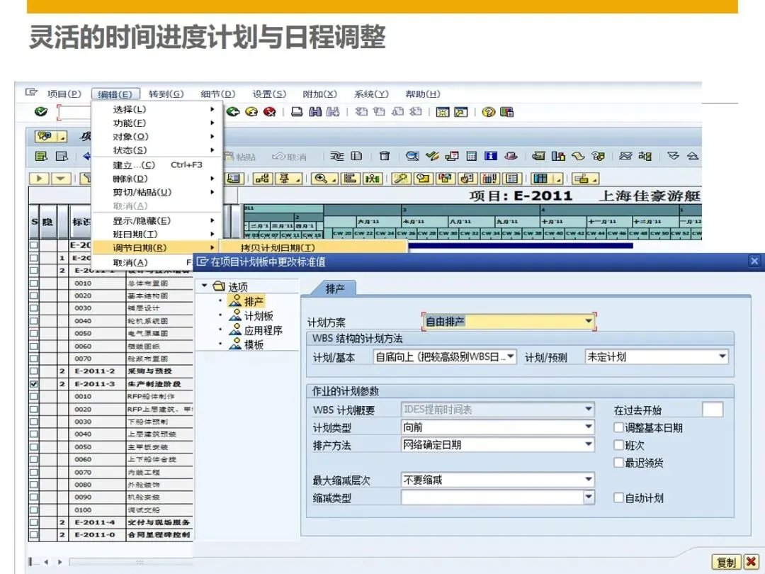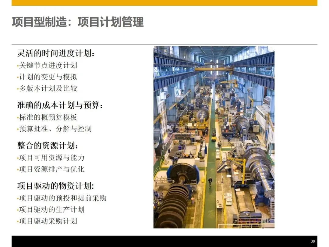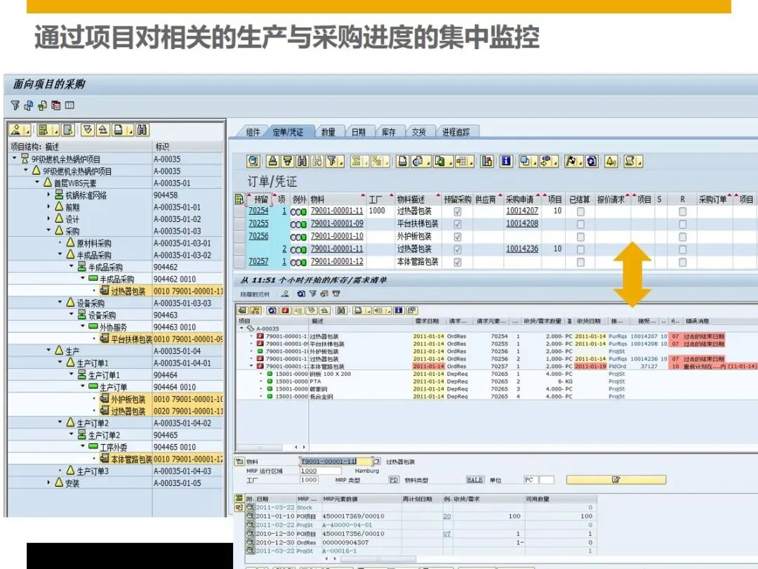 在生产制造方面,企业可以利用项目模板库快速分解零件装配和最终装配任务,利用网络计划和甘特图对生产过程进行可视化的管理,并对材料的一致性和缺件状况进行实时监测。采购管理支持库存预测采购、订单采购和直接采购等多种采购方式,可以将多个项目的采购需求组合在一起,统一下达采购订单,采用供应商评级、采购单、收货单和发票三单联动的方式,保证了采购的高效和资金的安全。在仓储方面,区分项目型库存和一般型库存,做到准确的物料分配,并对呆滞库存进行预警,减少企业的资金占用;