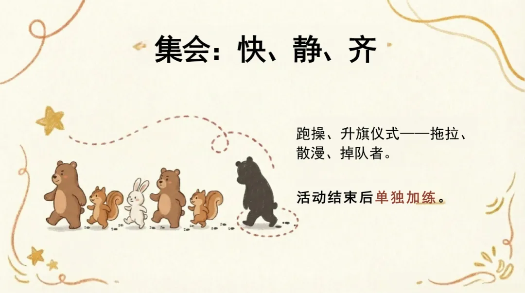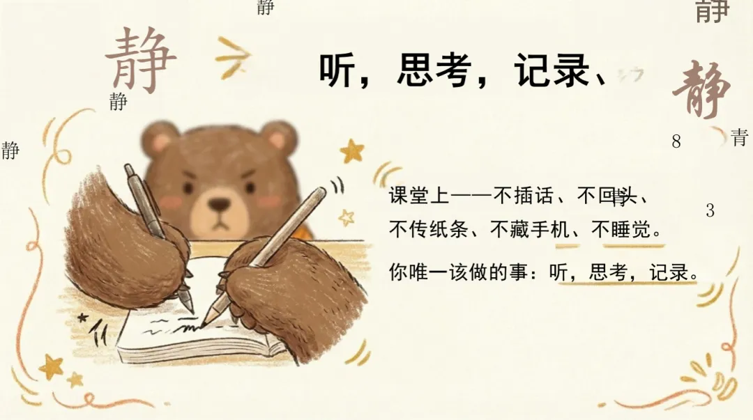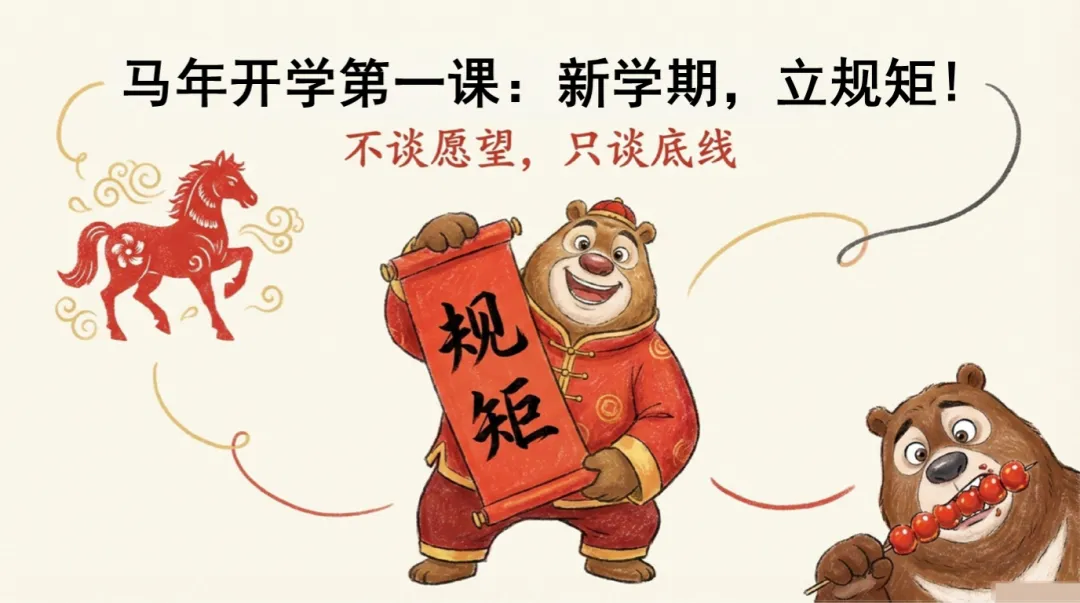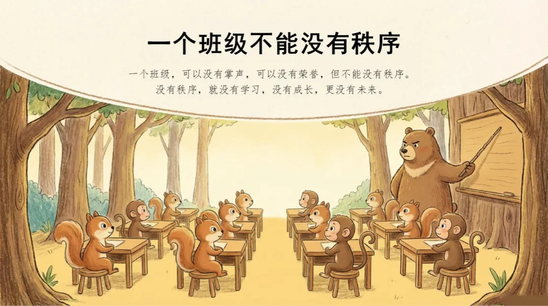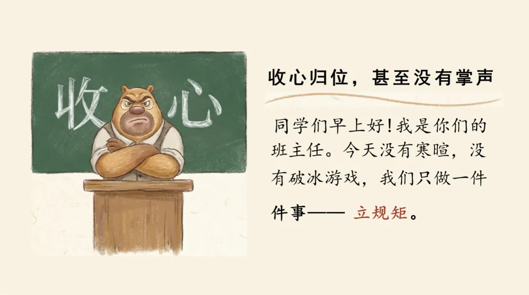 ·老师:同学们早上好!我是你们的班主任。今天,我们没有寒暄,也没有破冰游戏,我们要直接进入正题——立规矩。新学期开始了,我们需要收心归位,以全新的面貌迎接挑战。现在,没有掌声,我们直接开始。