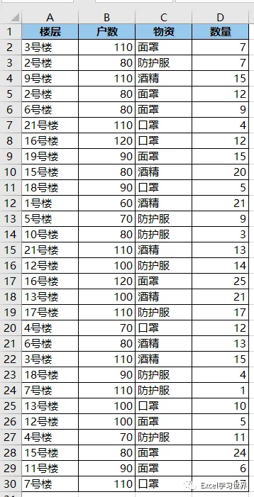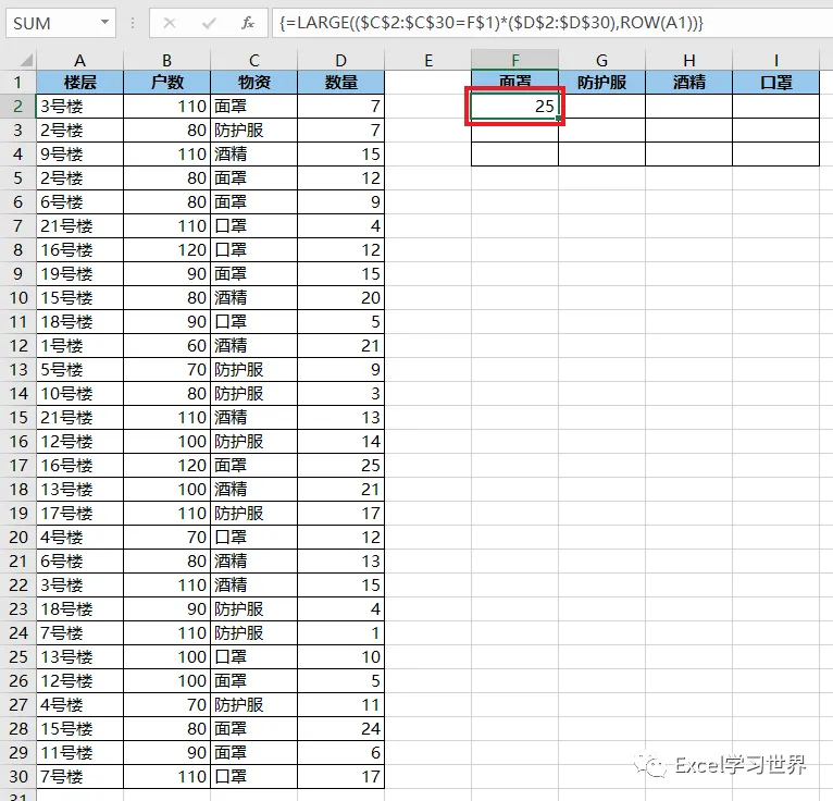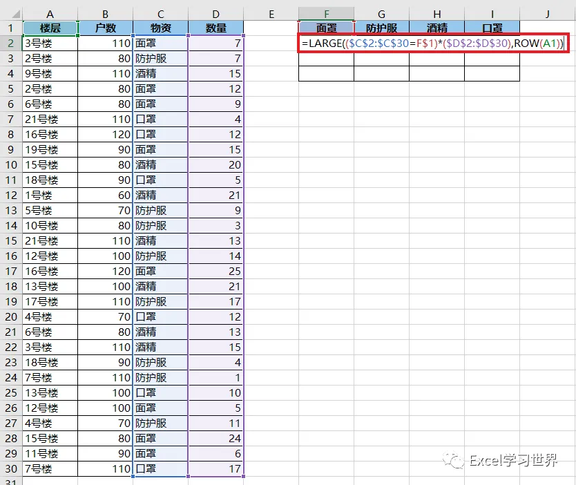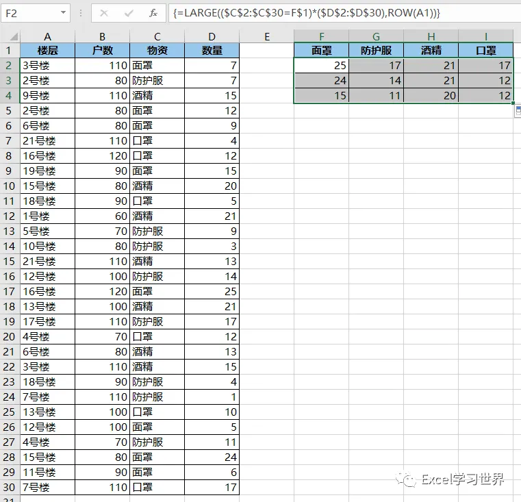 统计出下图 1 中每种物资的前三名数量,效果如下图 2 所示。
