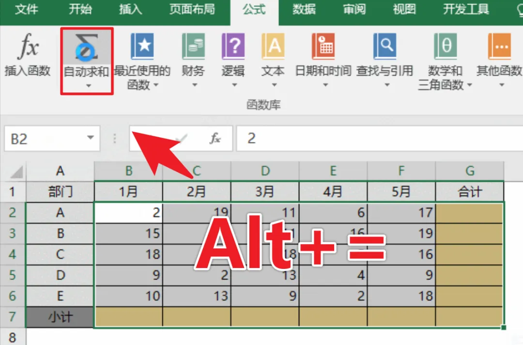 接着同时按下Alt和等号键,Excel便会智能识别数据边界,自动在下方或右侧插入SUM求和公式并显示结果。