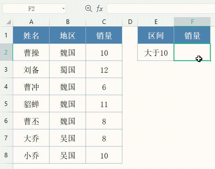 针对单条件且带有数值区间的求和需求,SUMIF函数是最佳选择。例如,要计算销量大于等于10的员工总销量,输入公式: