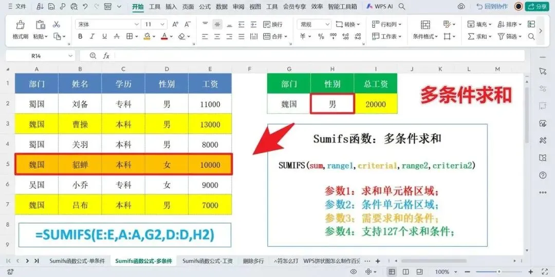 这里E:E代表求和的工资列,A:A和D:D分别是部门和性别的条件列,而“魏国”与“男性”则是具体的筛选标准。
