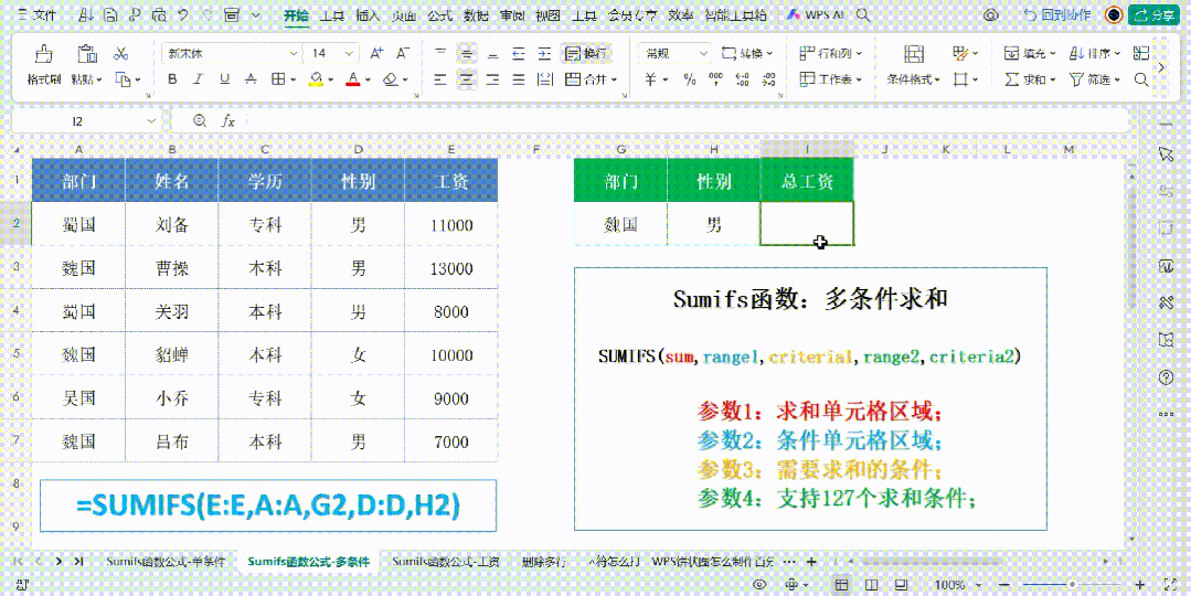 假设要统计“魏国”部门中“男性”员工的工资总额,直接在目标单元格输入SUMIFS公式:↓