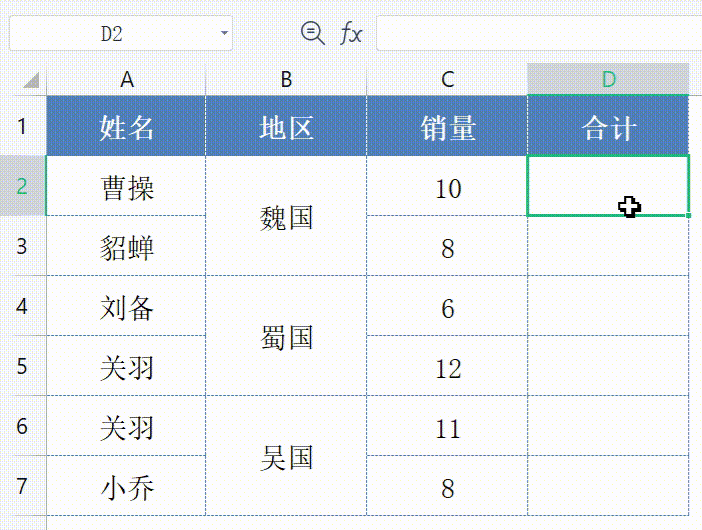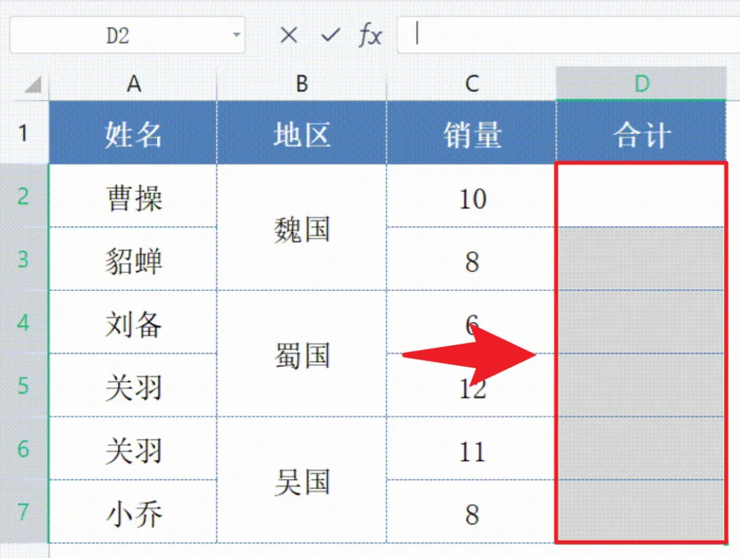 操作时,选中合并单元格旁的相邻区域(如D2:D7),在D2单元格键入公式: