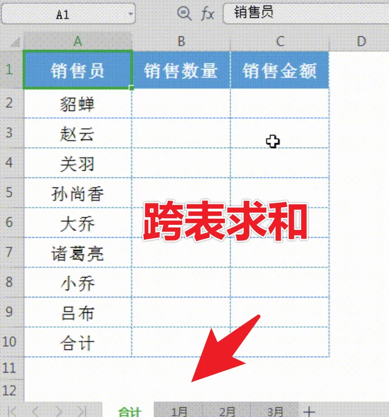 实际业务中,数据往往分散在不同工作表中,此时利用SUM函数结合三维引用可实现快速汇总。例如,当“1月”、“2月”、“3月”三个工作表结构相同时,在“合计”表的B2单元格输入:=SUM('1月:3月'!B2)