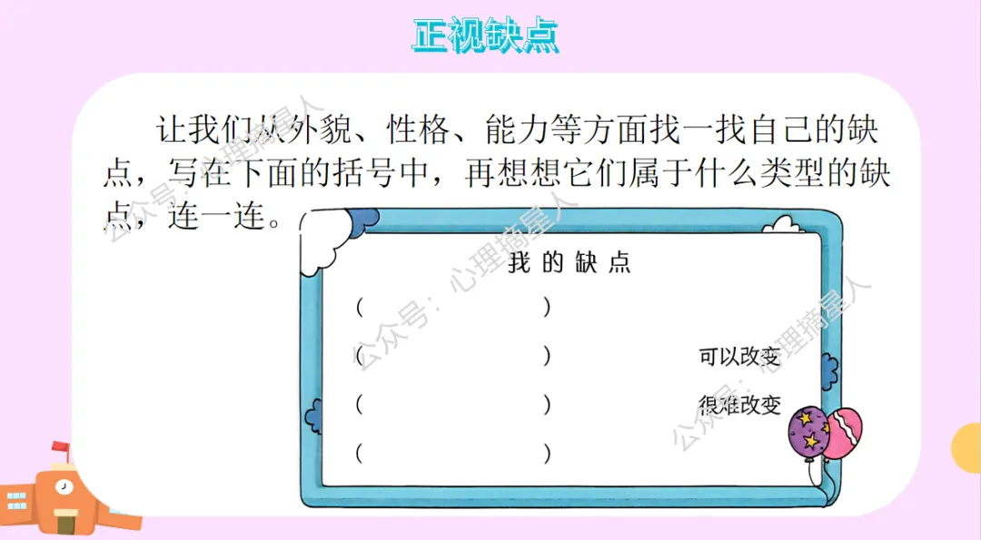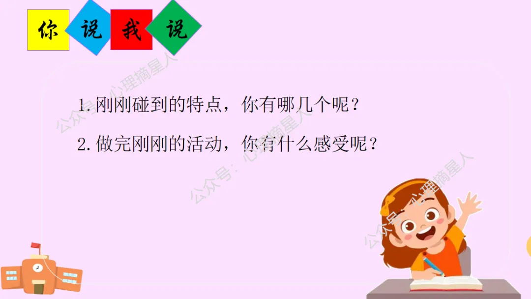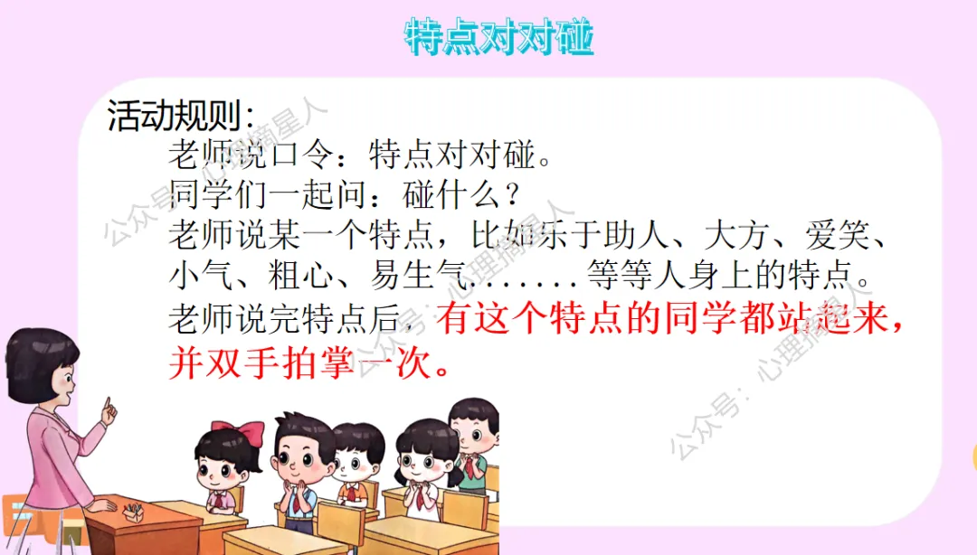 “特点对对碰”的活动能够迅速调动课堂氛围,提高学生上课的积极性。同时,学生在体验活动的过程中对自己的优缺点有了一个初步的认识,从而导入课题。。