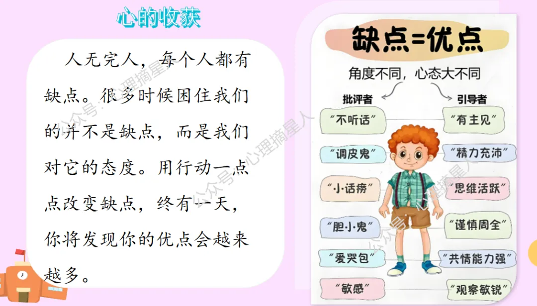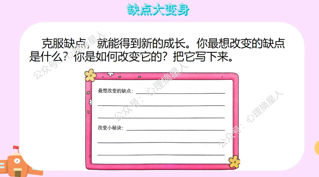 3.感受和体验克服缺点时的成就感和自信感,从而更喜欢自己。