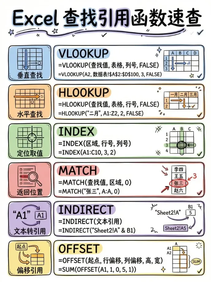 Offset:从指定基准位置,按行列偏移量返回指定引用,适用于批量调取某供应商多批次来料数据。 语法:=Offset(基准点,偏移行数,偏移列数,返回行数,返回列数) 实操案例(SQE专属):以A1(供应商编码SUPP-001)为基准,向下偏移2行、向右偏移3列,返回1行1列的值(即该供应商第3批次的不良数量),输入=Offset(A1,2,3,1,1),快速调取指定批次数据。