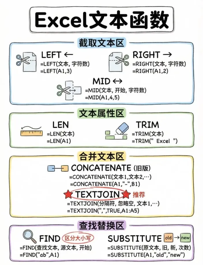 SQE核心场景对应函数: 清除字符串空格:Trim/Ltrim/Rtrim(清理供应商名称、检验项目名称空格) 合并单元格内容:Concatenate(或&符号,合并供应商编码+来料批次,生成唯一标识) 截取字符串:Left/Right/Mid(截取供应商编码、来料批次中的关键信息) 替换单元格内容:Replace/Substitute(替换不良品描述、规范检验结果表述) 查找文本位置:Find/Search(查找检验项目、不良原因在表格中的位置) 统计字符个数:Len/Lenb(统计供应商编码位数、不良品描述字符数,规范录入)
