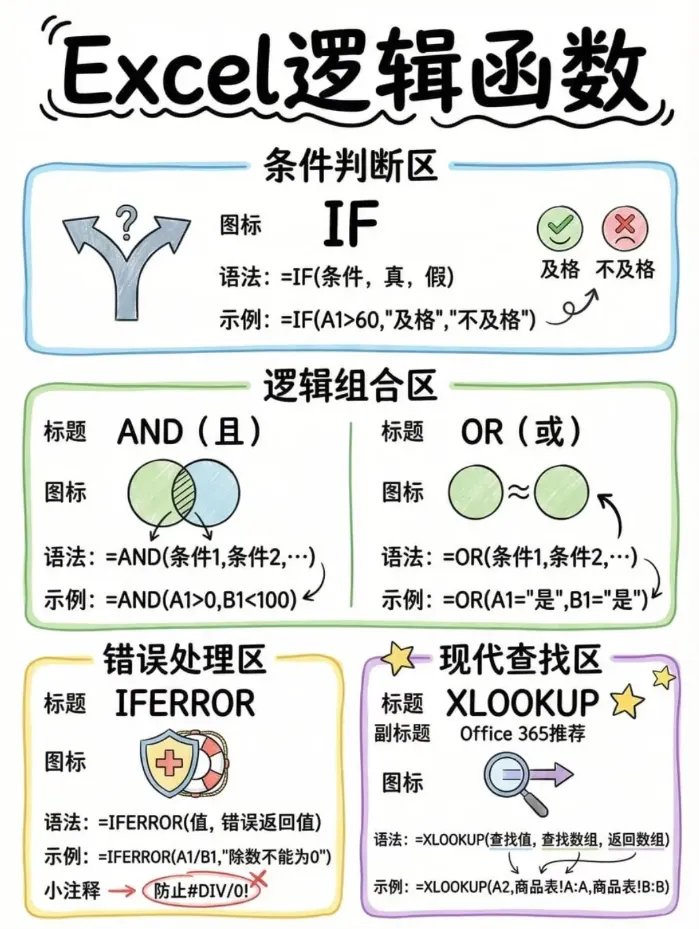 IF:条件判断,满足条件返回一个值,不满足返回另一个值,SQE最常用於来料检验结果判定、供应商合格判定。 语法:=IF(条件,条件为真时返回值,条件为假时返回值) 实操案例(SQE专属):判断A2单元格的来料不良率(数值)是否合格(≤5%为合格),输入=IF(A2≤5%,"合格","不合格");判断供应商月度绩效得分(B2)是否达标(≥80分为达标),输入=IF(B2≥80,"达标","不达标")。