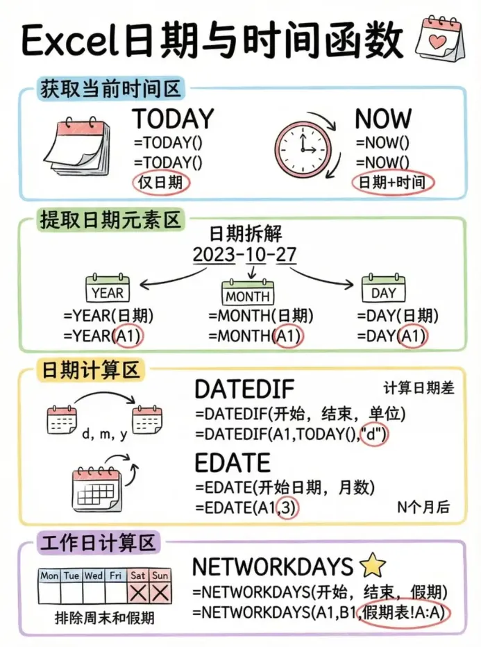 适用场景:SQE日常处理来料日期、供应商整改期限、检验时效统计等时间相关数据,包括获取当前检验日期、提取来料月份、计算整改剩余天数等,适配时间相关的质量管控场景。
