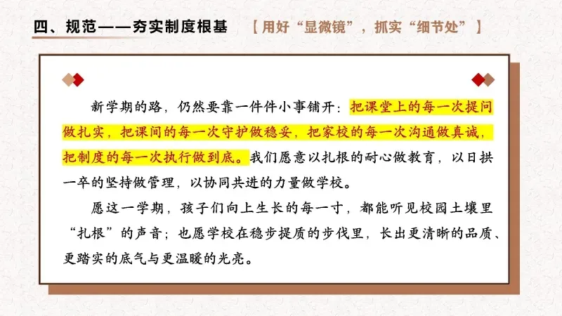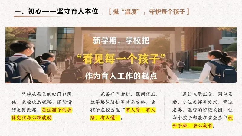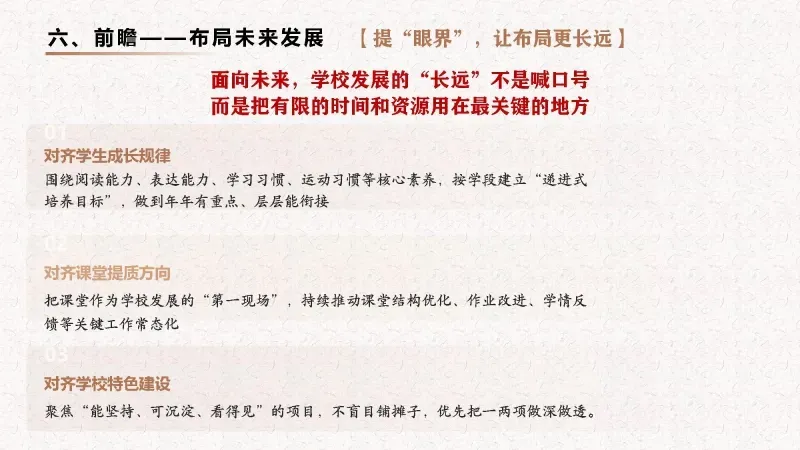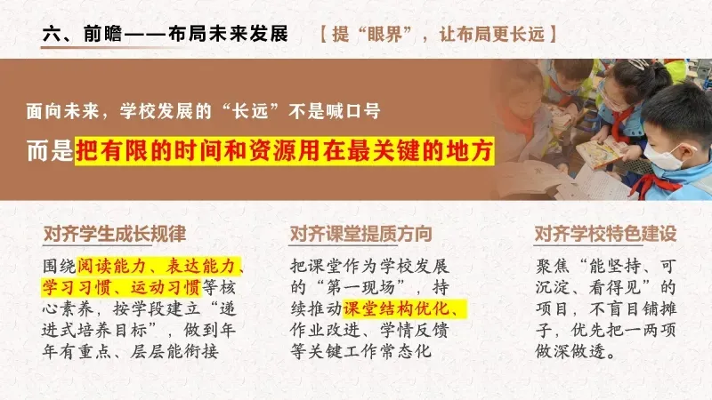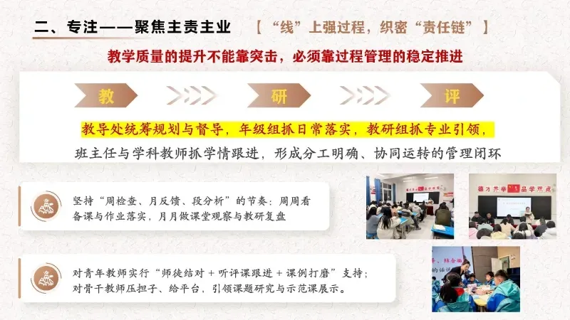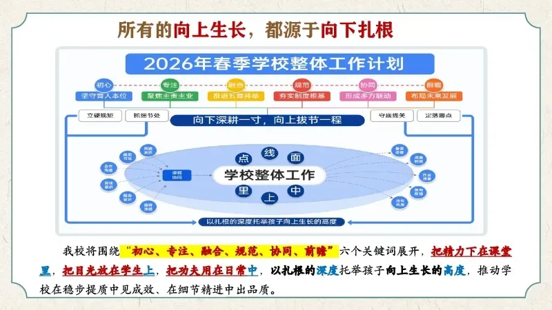 把精力下在课堂里,把目光放在学生上,把功夫用在日常中,以扎根的深度托举孩子向上生长的高度,推动学校在稳步提质中见成效,在细节精进中出品质。