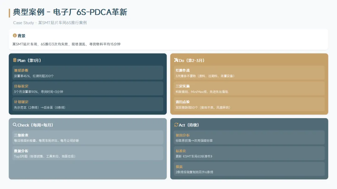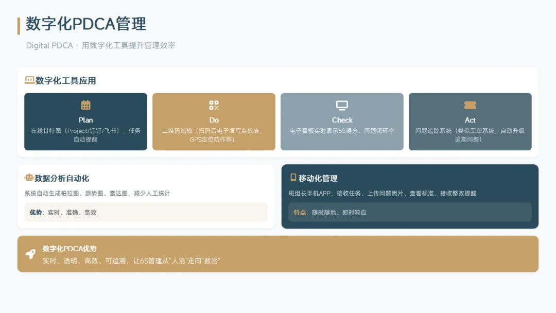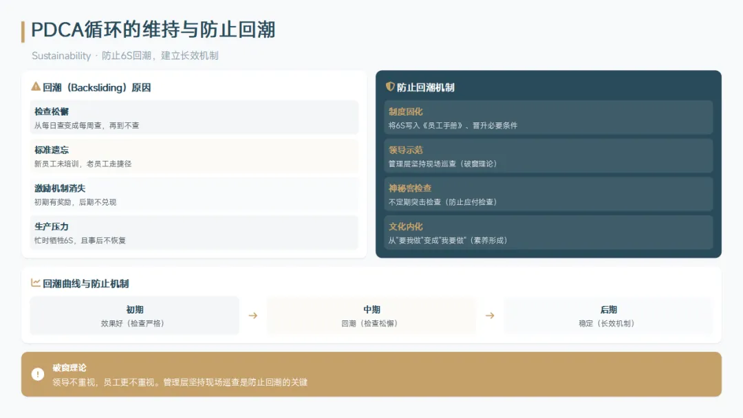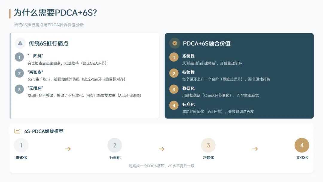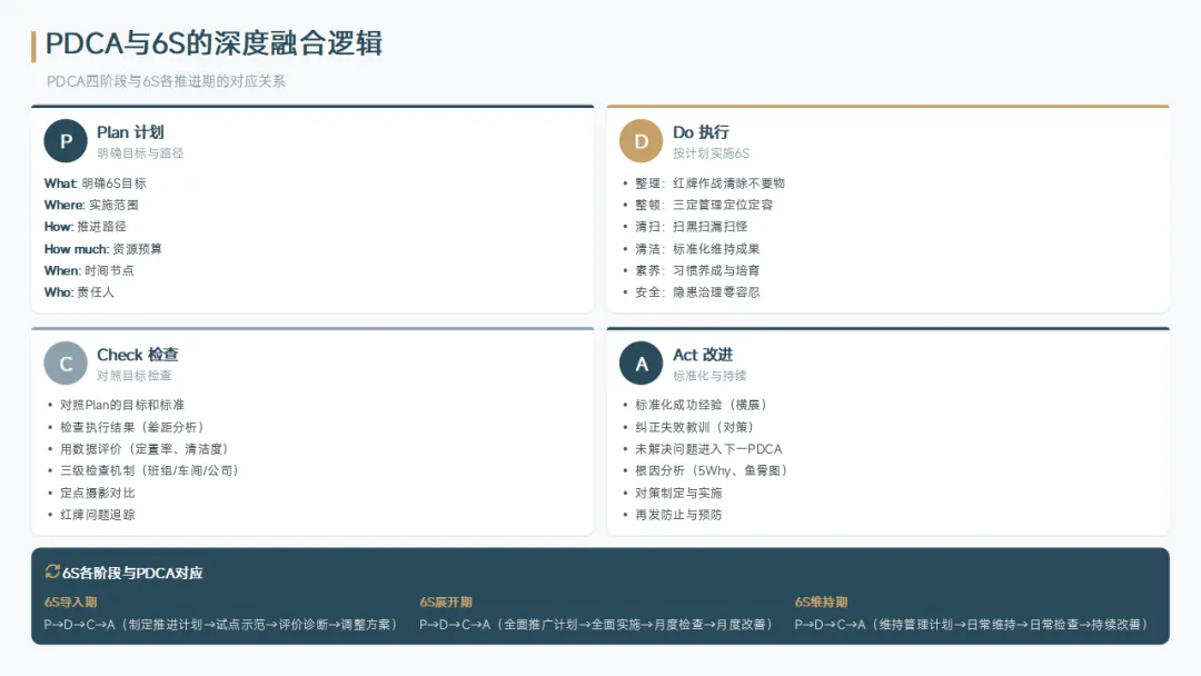 。就像减肥,光节食不称体重、不调整方案,必然反弹。传统6S往往只有P和D:领导说要搞6S(Plan),大家动手整理(Do),但搞完后没有持续的检查机制,没有将成果标准化的改进措施,所以无法维持。
