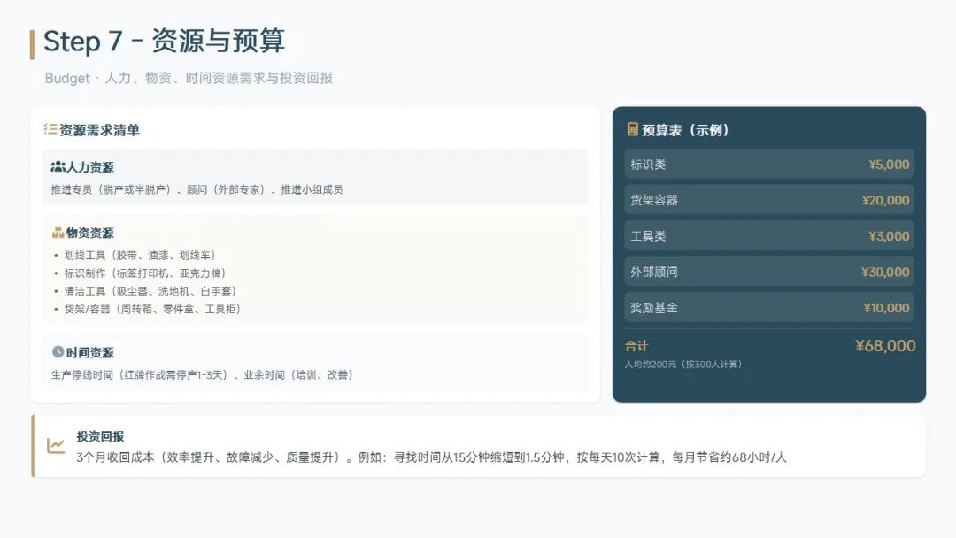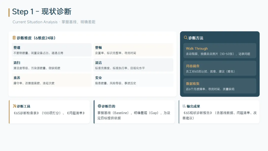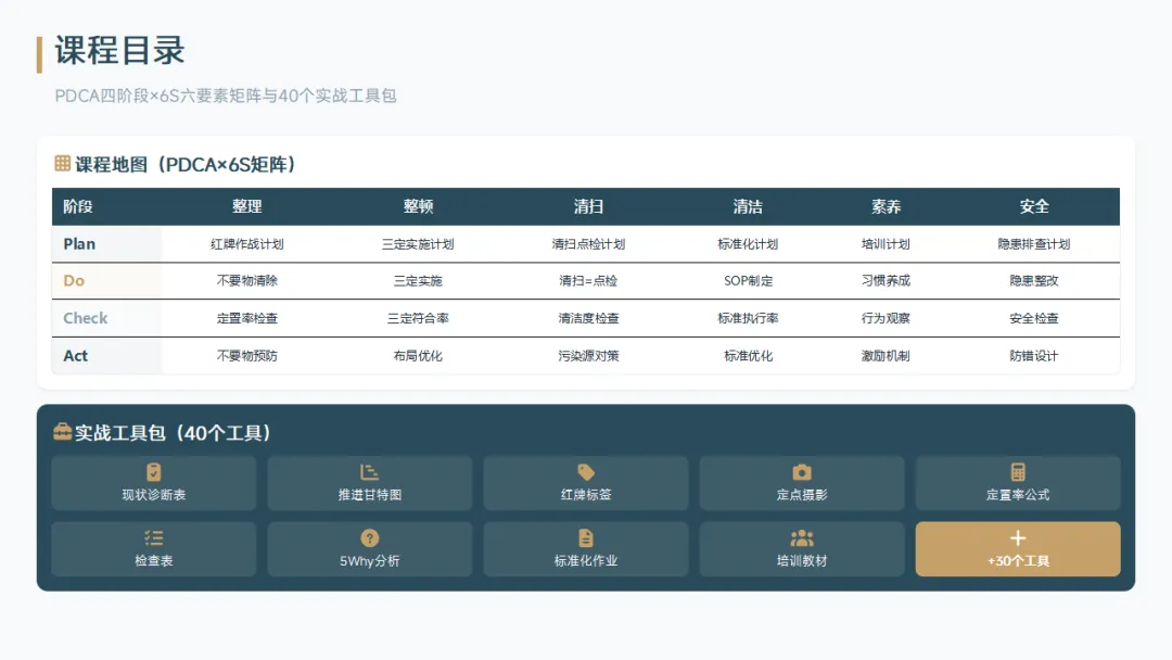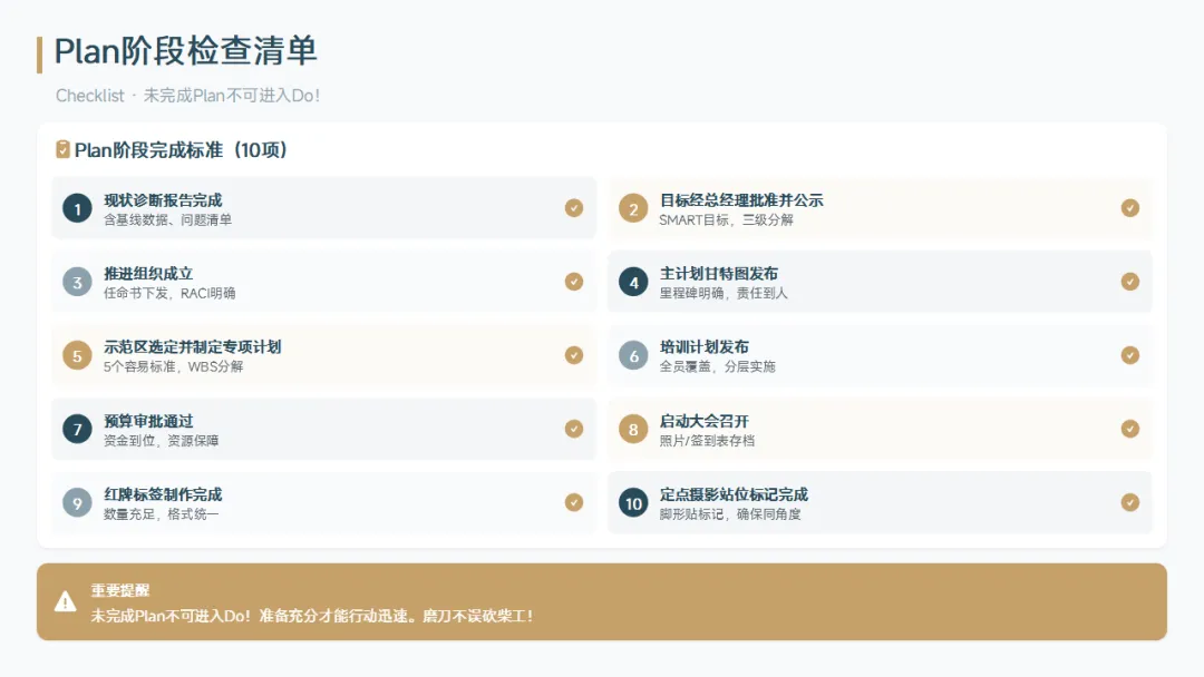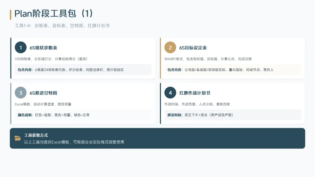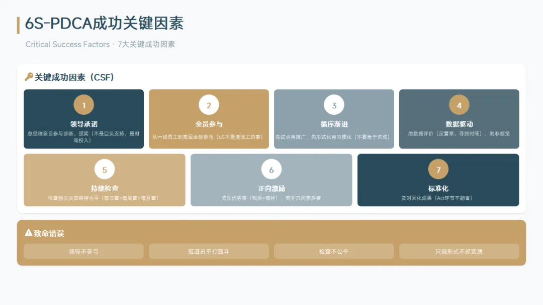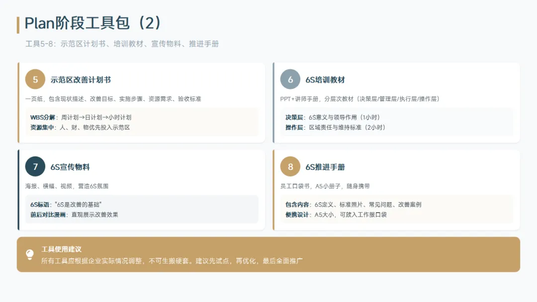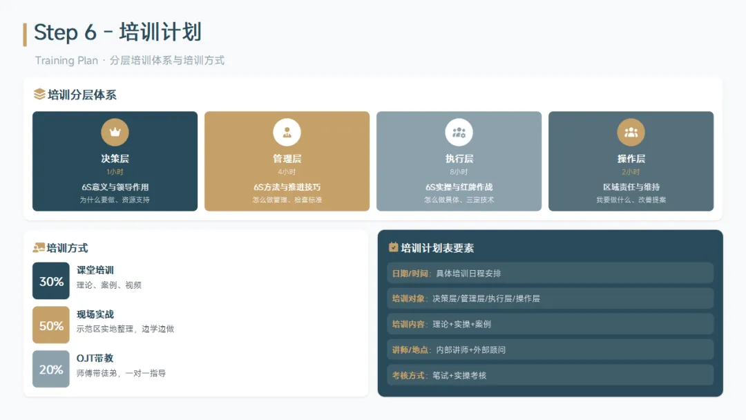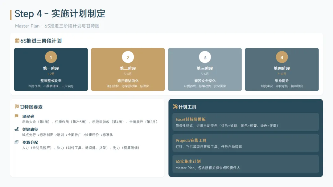 。6S不是独立于生产之外的"面子工程",而是提升生产效率、保障质量、确保安全的基础手段。如果计划阶段没有明确"6S如何服务于生产",必然导致执行层面的抵触。