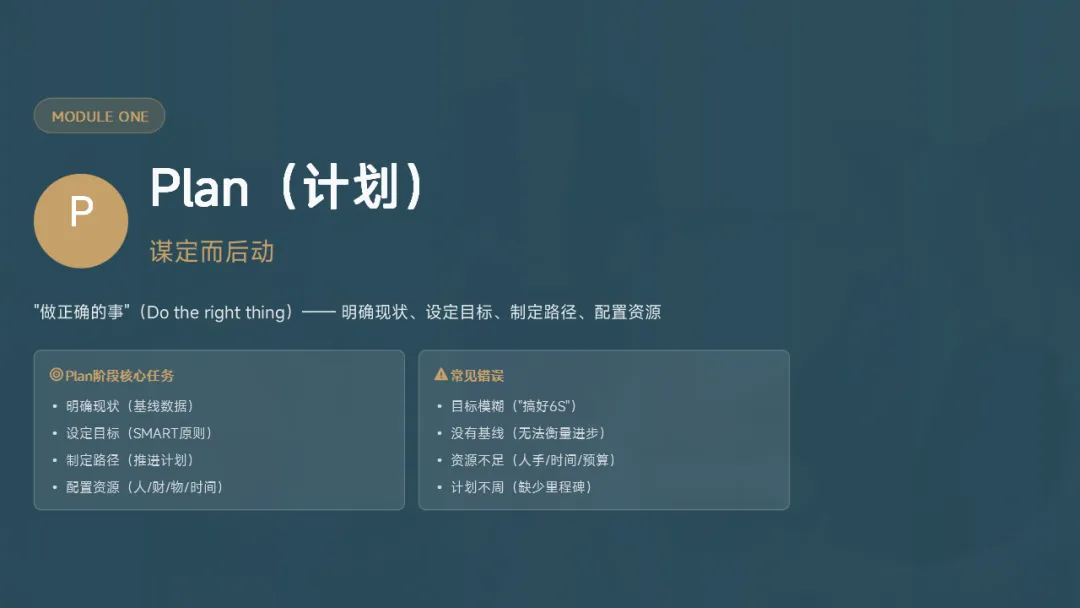 Plan阶段的核心任务是"做正确的事"。很多6S推进失败,根源在于计划阶段就错了。Plan阶段我们要回答五个问题(5W1H):