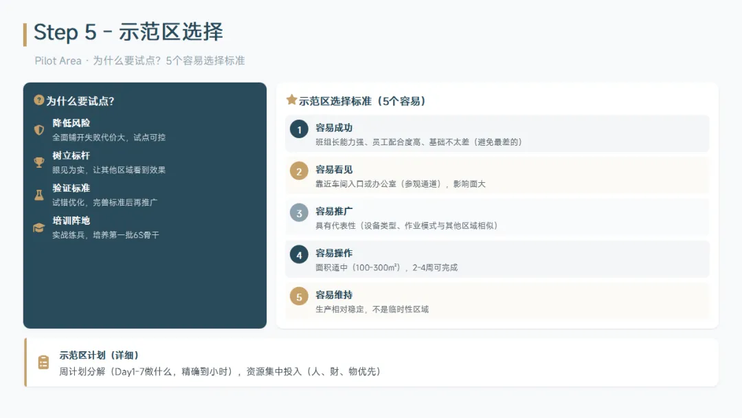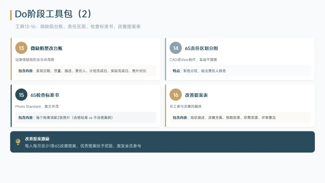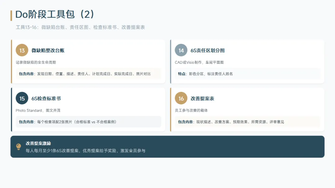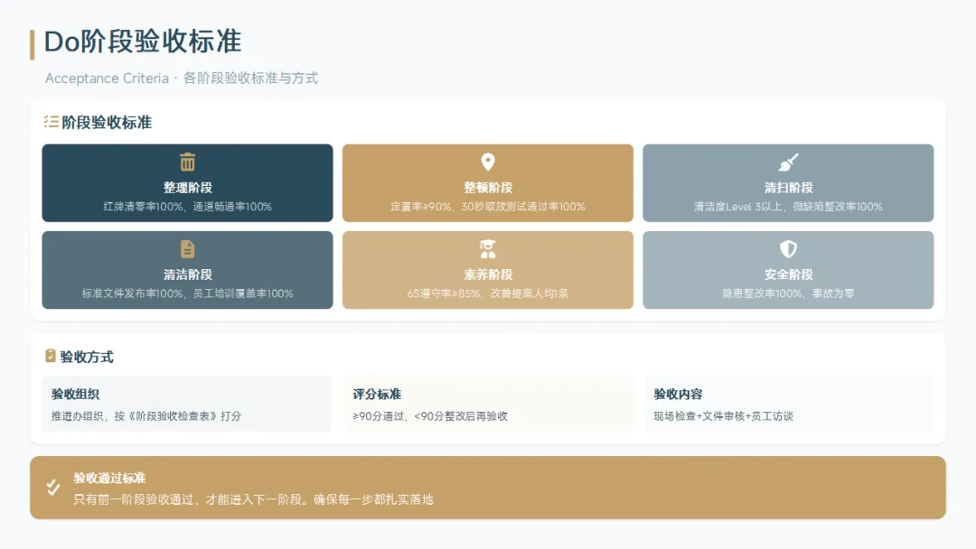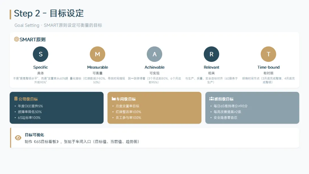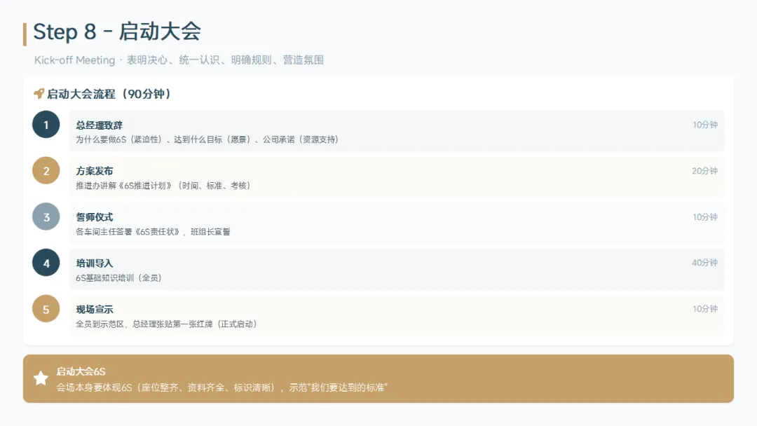 :明确6S目标,不是笼统的"搞好6S",而是"定置率达到95%,红牌整改率100%";