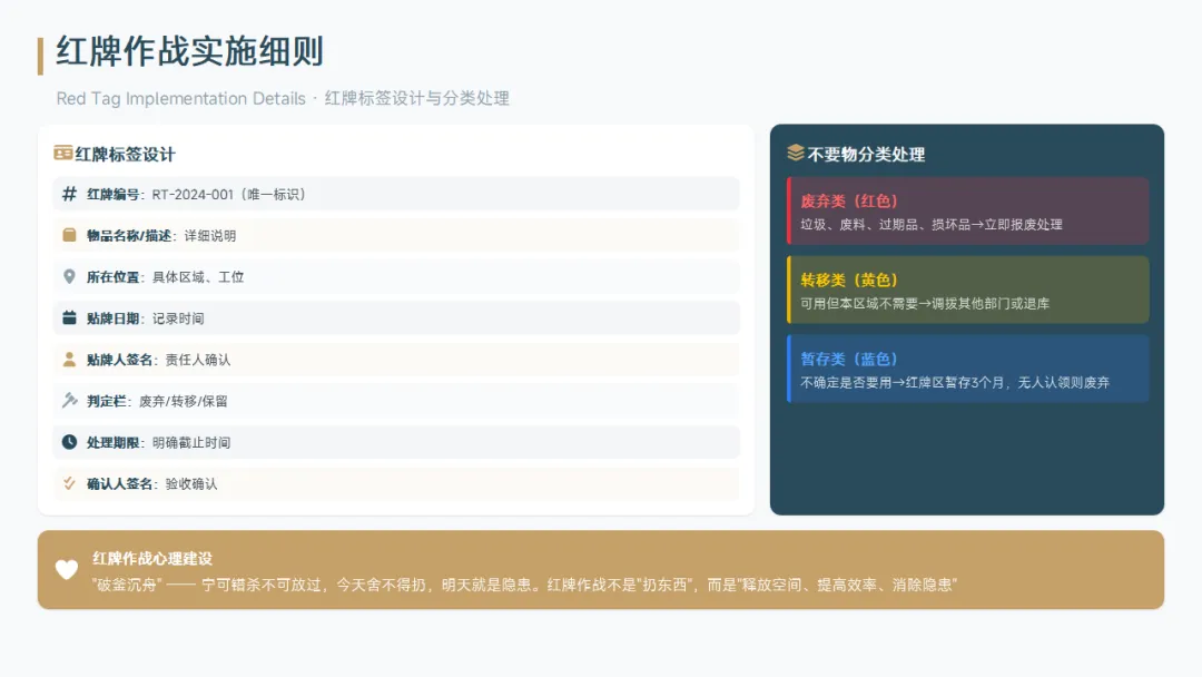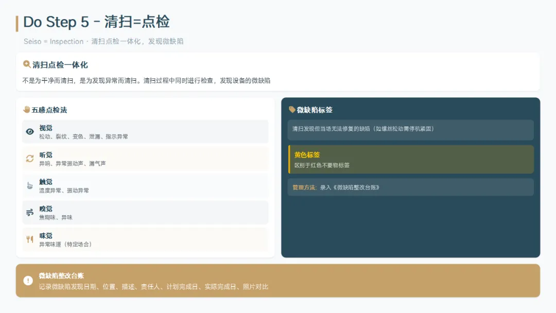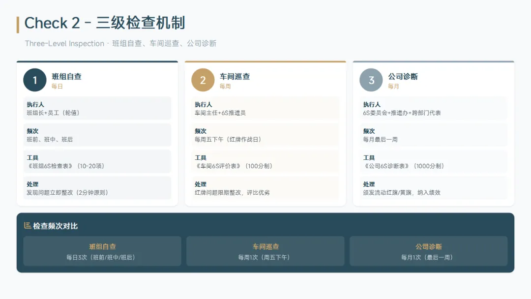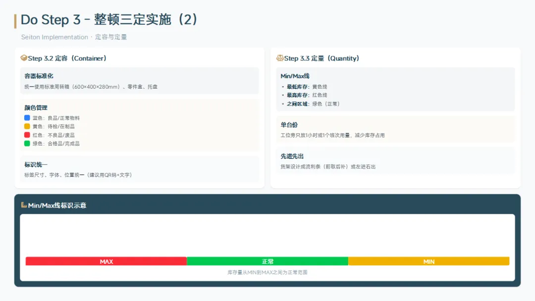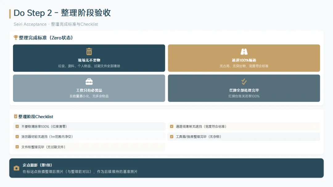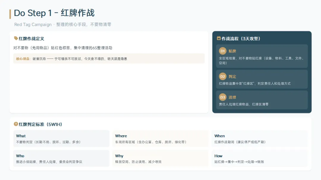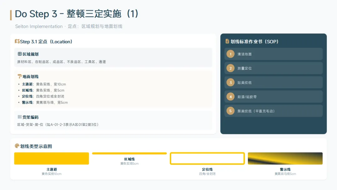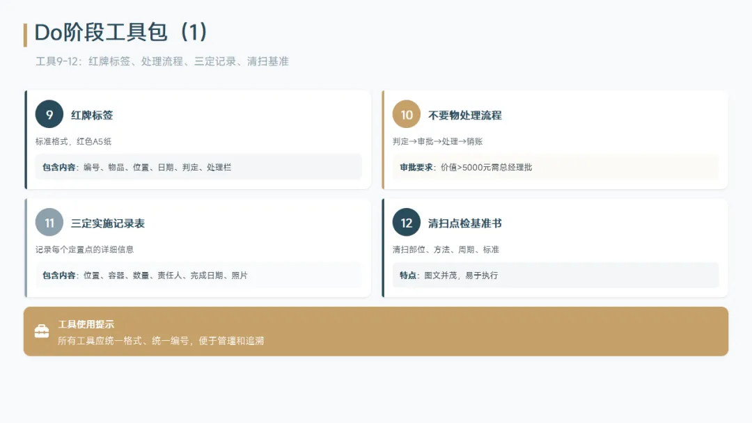 这是硬件改造阶段。通过红牌作战清除不要物,通过三定管理划线定位。这个阶段的特点是"靠检查维持",员工是被动执行。但这没关系,这是必经阶段。