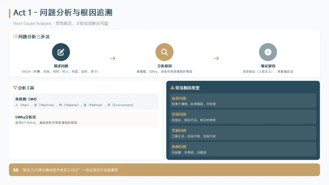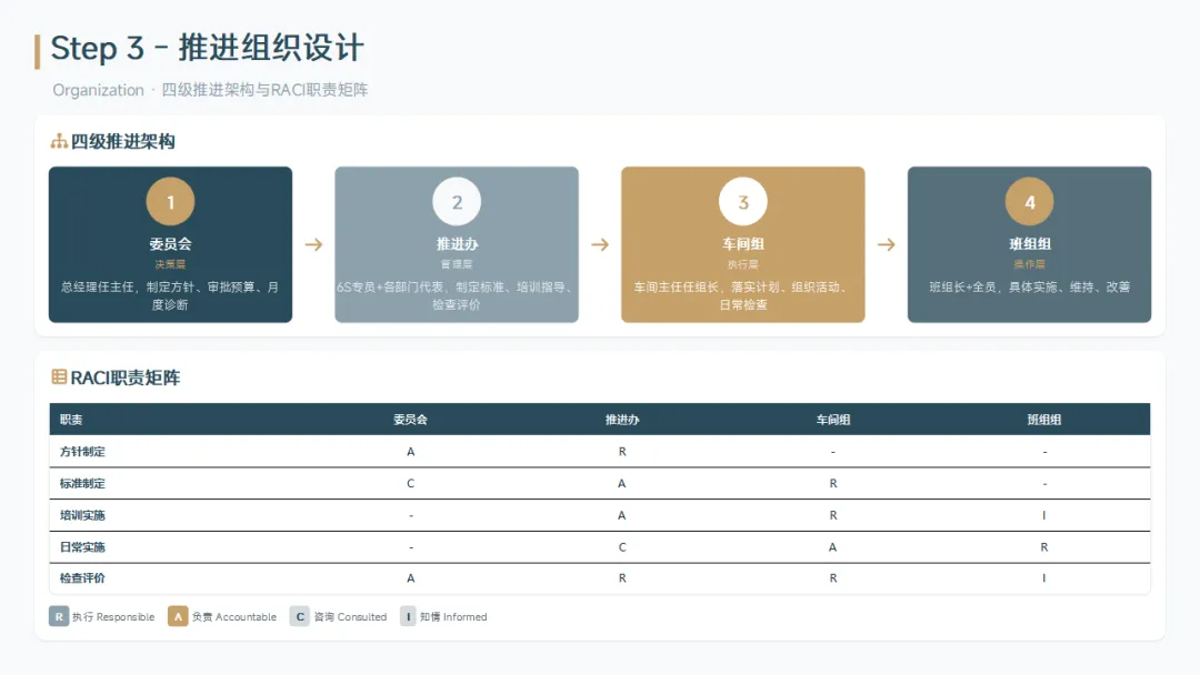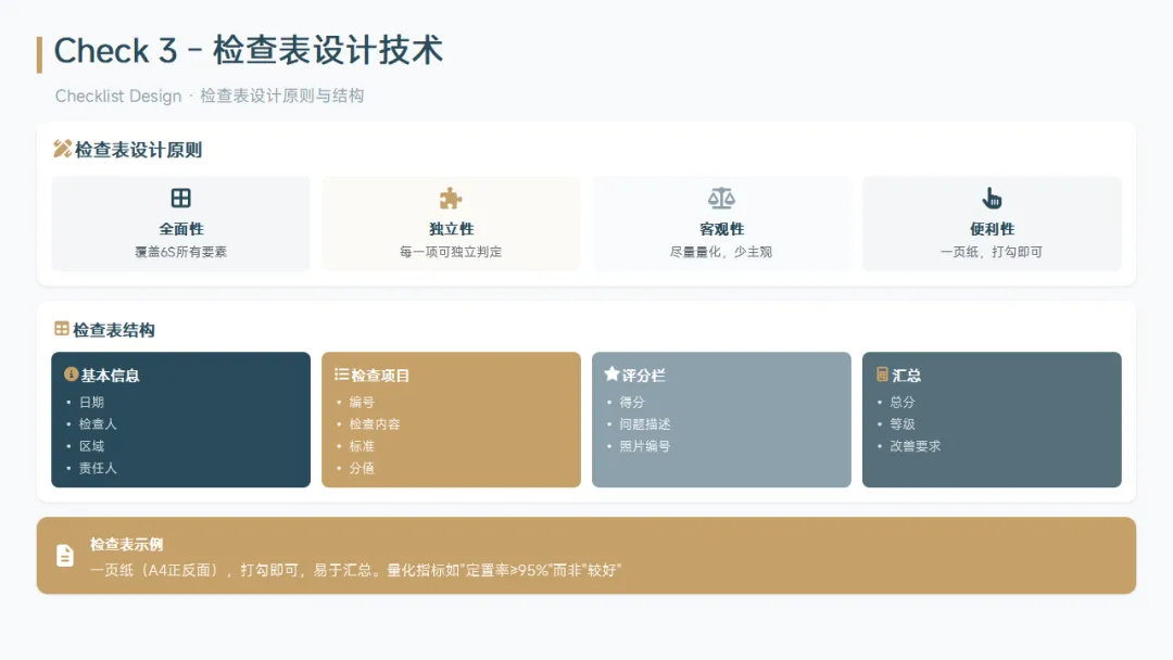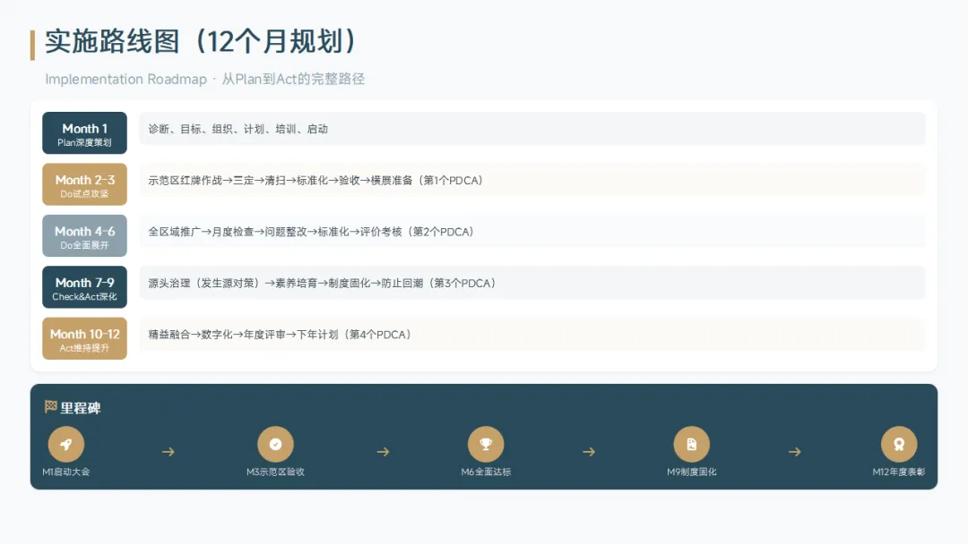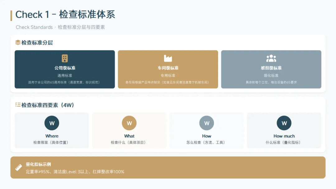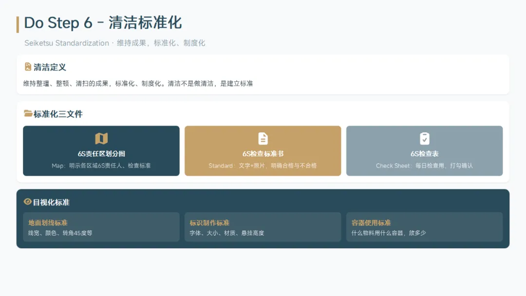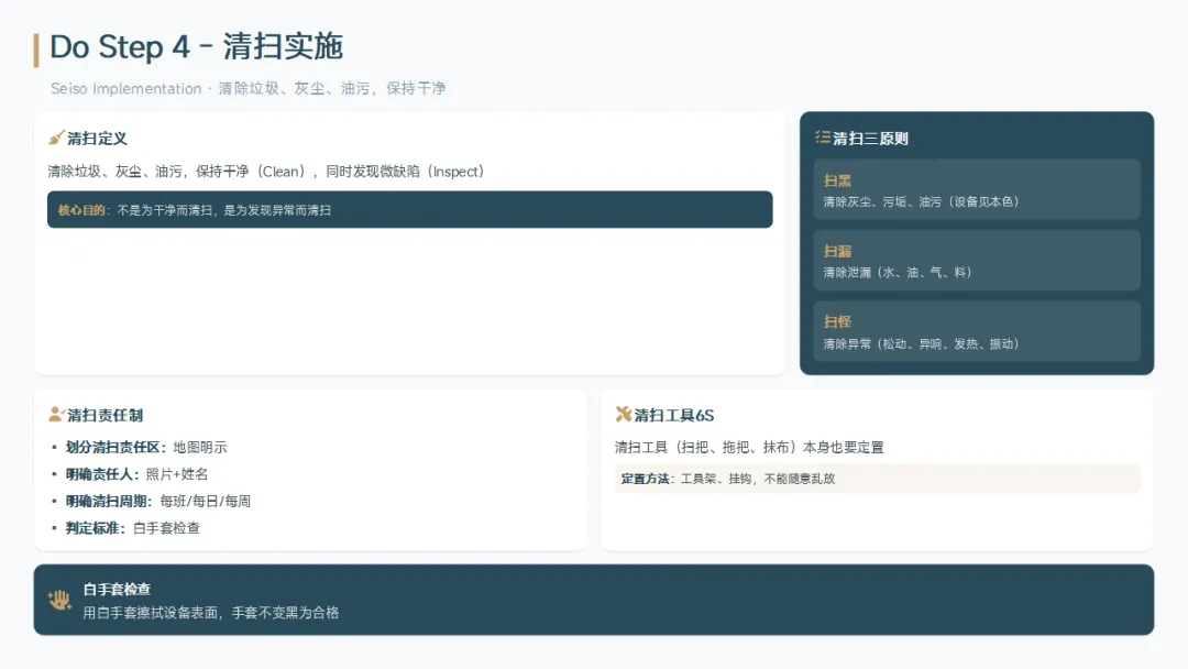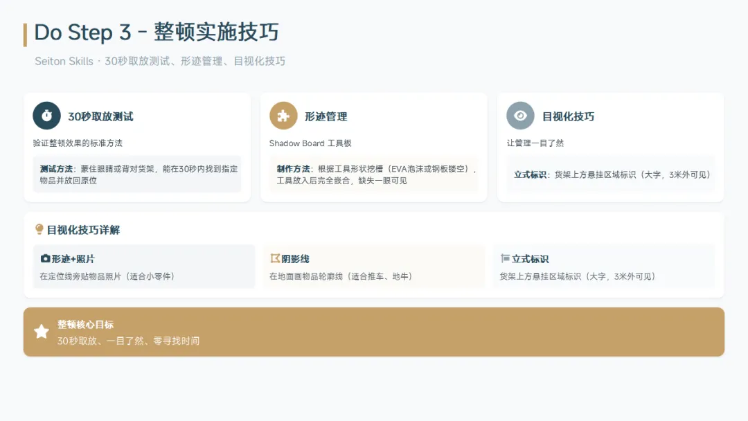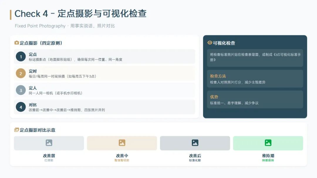 这是硬件改造阶段。通过红牌作战清除不要物,通过三定管理划线定位。这个阶段的特点是"靠检查维持",员工是被动执行。但这没关系,这是必经阶段。