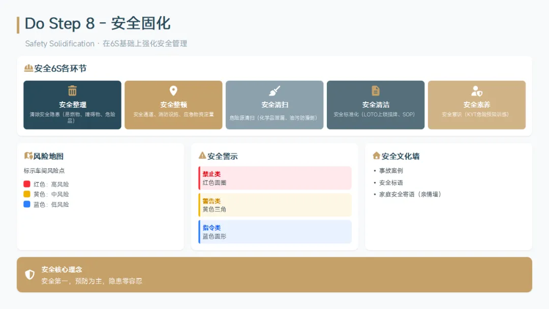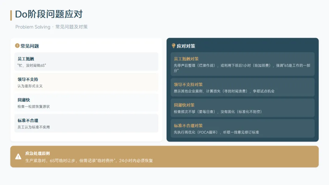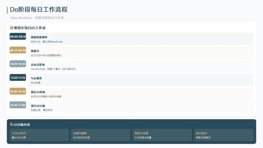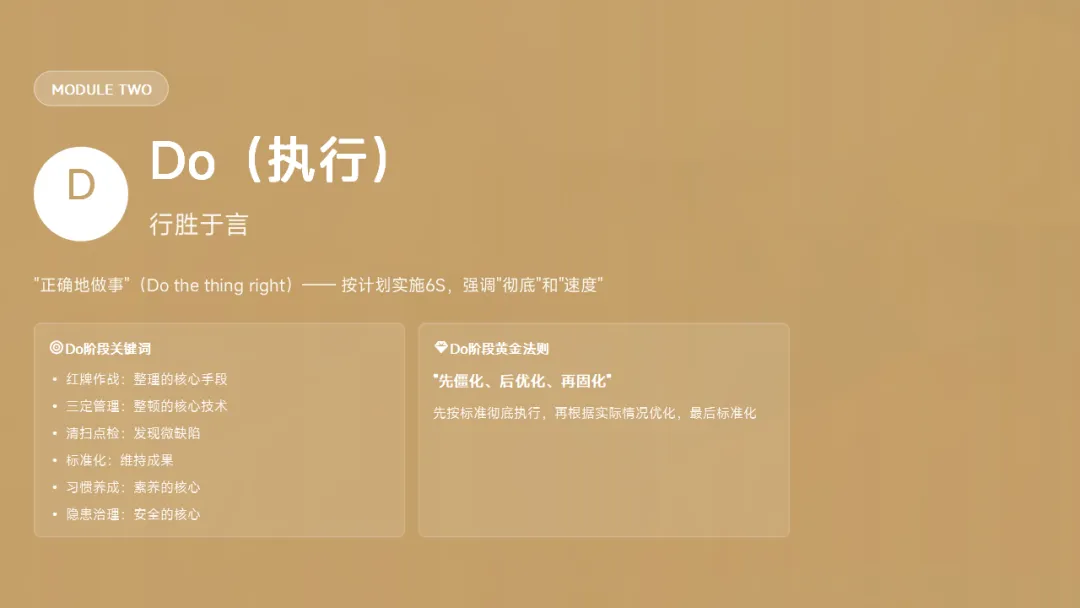 Do阶段的关键词是"正确地做事"和"彻底"。6S的Do阶段包含六个要素的落地: