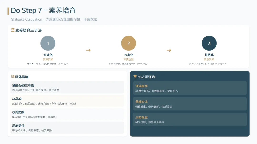 这是行为改变阶段。员工不做6S会感到不舒服,形成了肌肉记忆。班前会6S三句话成为本能,改善提案成为习惯。