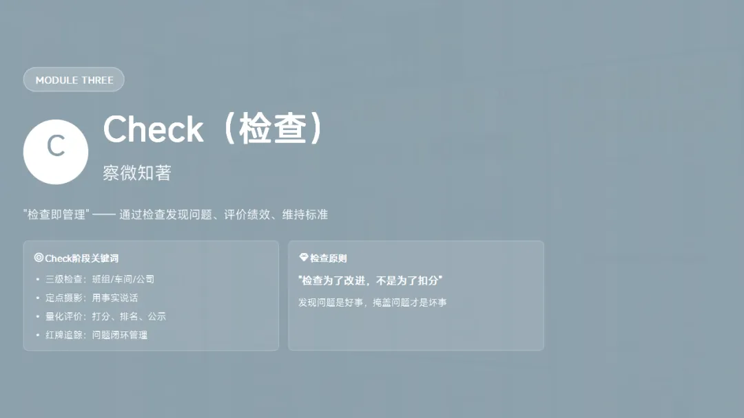 Check阶段不是简单的"挑毛病",而是通过检查发现问题、评价绩效、维持标准。包含: