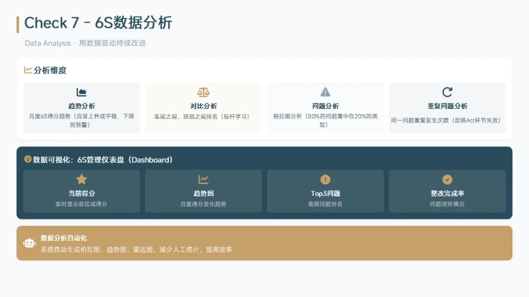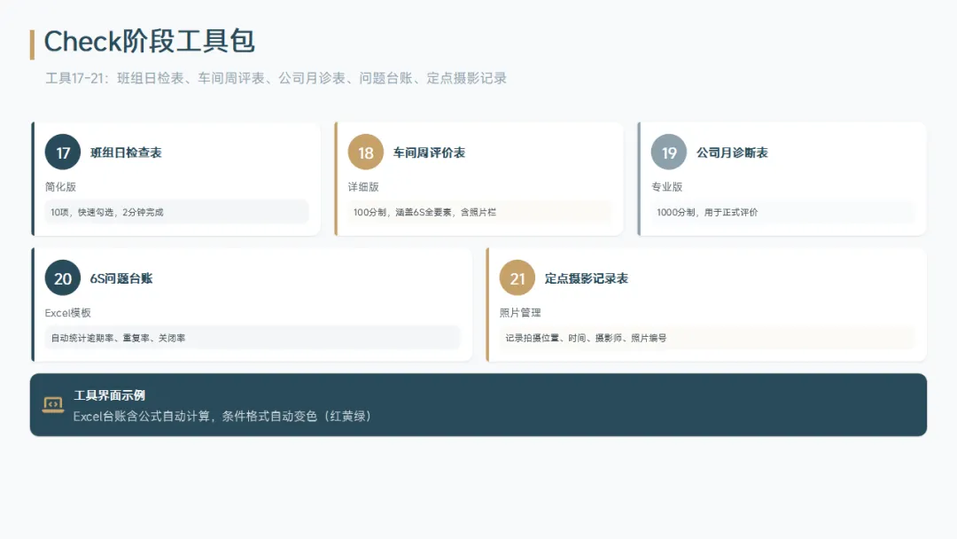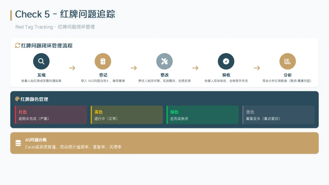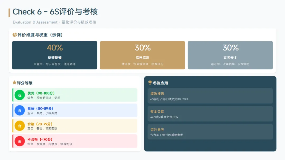 传统的6S检查往往是"感觉还不错"或者"看起来挺乱"。Check阶段强调的是量化评价:定置率从60%提升到95%,寻找时间从15分钟缩短到1.5分钟,红牌问题关闭率100%。数据是客观的,也是可追溯的。