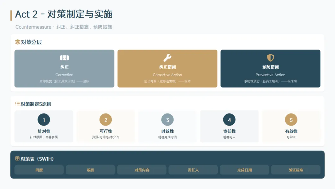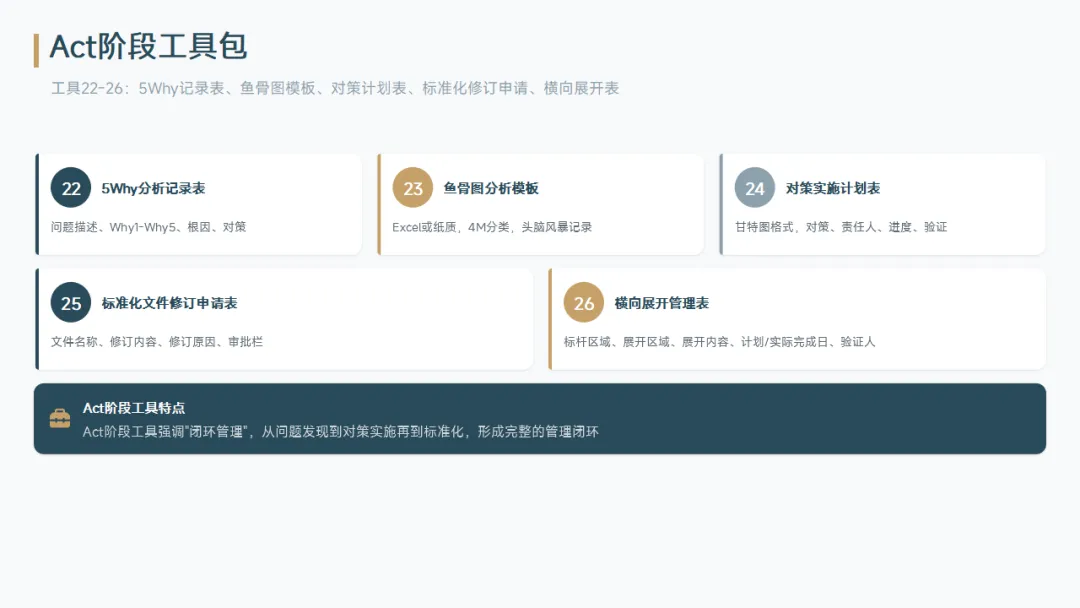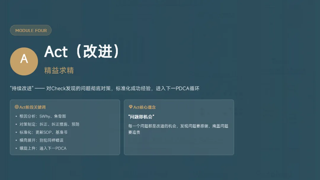 Act阶段是PDCA循环中最考验管理功力的环节。包含: