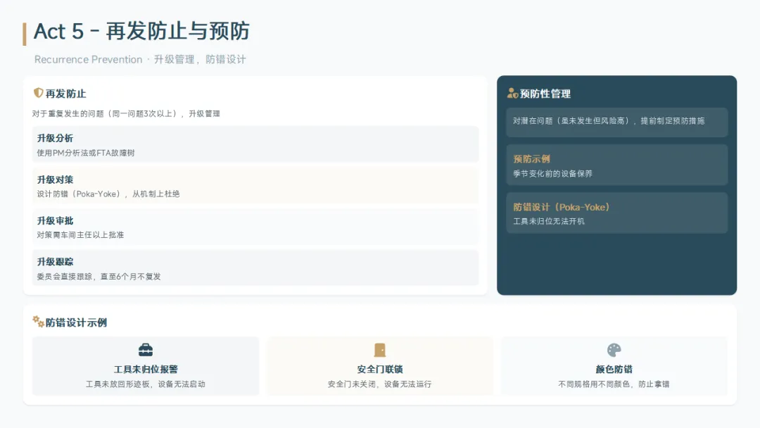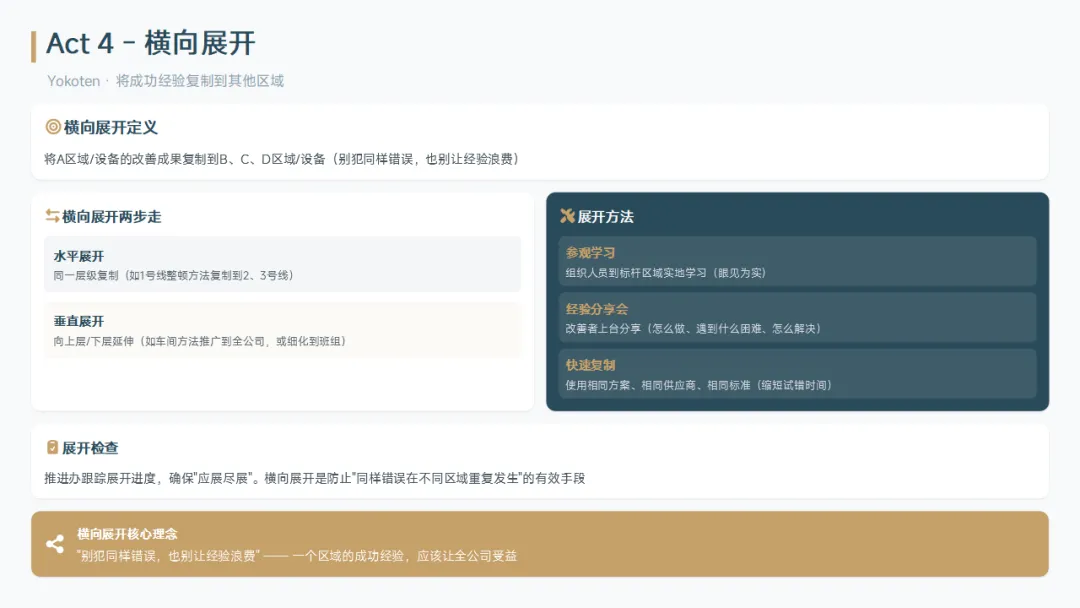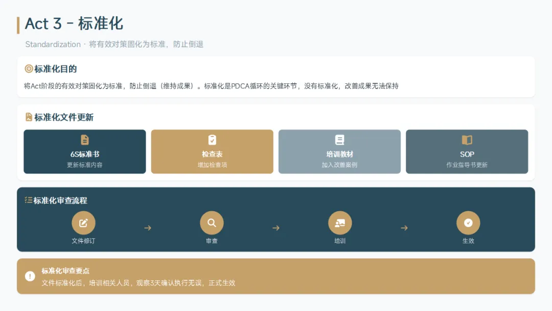 Act阶段的核心就是标准化。A区域改善成功的经验,通过横向展开(Yokoten)复制到B、C、D区域;某次失败的原因分析,通过防错设计(Poka-Yoke)确保不再发生。这样企业的6S能力就在不断积累,而不是每次都重新开始。