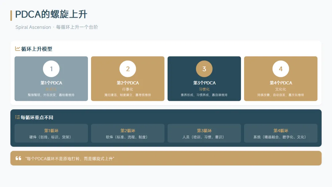 请大家看屏幕上的这个模型(指向PPT中的螺旋图)。每一个PDCA循环不是回到原点,而是上升一个台阶。第一个循环我们实现了"形式化"——现场看起来整洁了;第二个循环上升到"行事化"——有了制度和流程;第三个循环到"习惯化"——员工自觉执行;第四个循环到"文化化"——成为企业的DNA。这才是真正的持续改善。