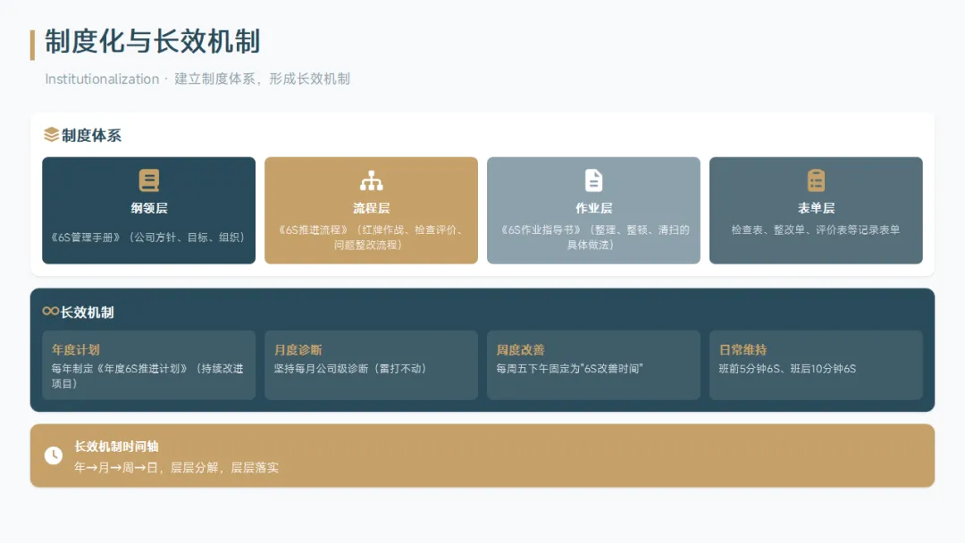 这是制度建设阶段。制定6S标准书、检查表、责任区划分。员工开始按照制度做事,虽然可能还不是发自内心,但已经形成了工作流程。
