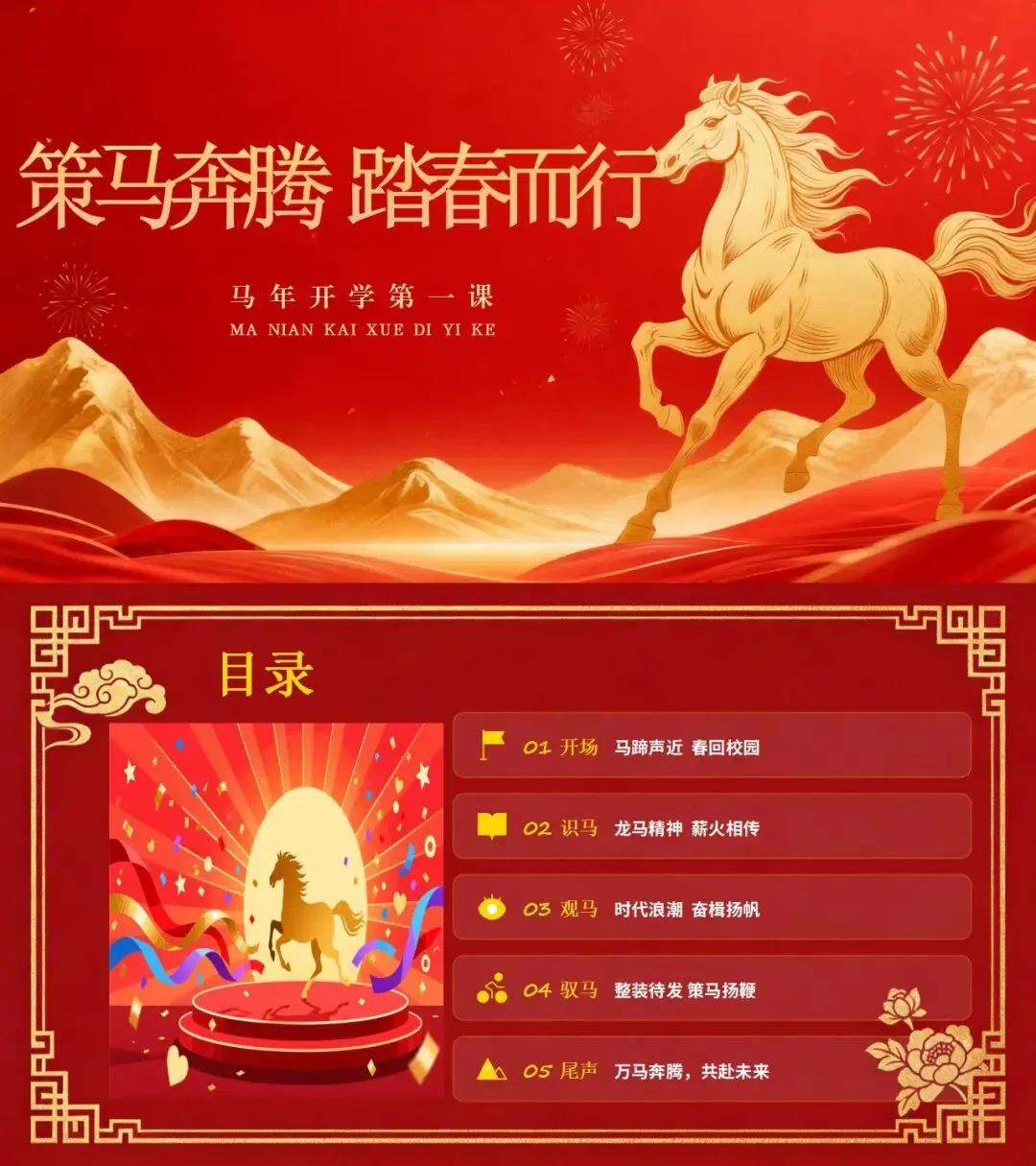 寒尽春归,暖意渐浓,愉快又充实的寒假已悄然临近尾声,喧嚣了一个假期的“神兽”们,也即将收拾好松弛的心情,背起装满期待的书包,告别舒适的居家时光,重返熟悉的校园,奔赴一场与知识、成长的全新约定。新学期,新起点,新征程,恰逢丙午马年,为了让每一位老师都能轻松开启开学序章,高效备好开学第一课,省去繁琐的备课耗时,我们精心筹备了几份最新马年主题开学第一课PPT,搭配完整配套教案与逐字讲稿,全方位助力老师们打造一堂有温度、有内涵、有仪式感的开学第一课。