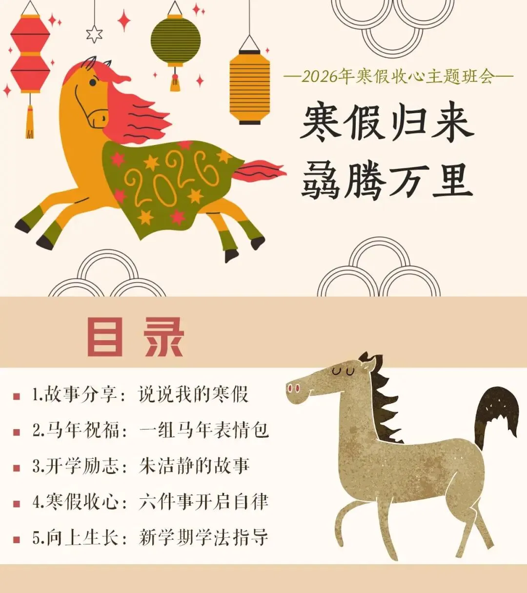 神兽归笼,师者护航。新学期的钟声即将敲响,愿每一位老师都能卸下备课的疲惫,借助这份精心准备的马年开学第一课资料,轻松开启新学期的教学工作;愿每一位同学都能在开学第一课的引导下,收起假期的浮躁,怀揣梦想、奋勇争先,以饱满的热情、昂扬的姿态,像骏马一样驰骋在知识的草原上,不负时光、不负韶华,在新的一年里收获成长、收获进步,开启属于自己的精彩新学期。