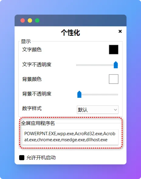 三、在个性化设置里,我们增删需要启用倒计时/计时的程序,比如某个游戏,某个全屏显示的程序,这样一旦该程序全屏则会开始进行倒计时/正计时。