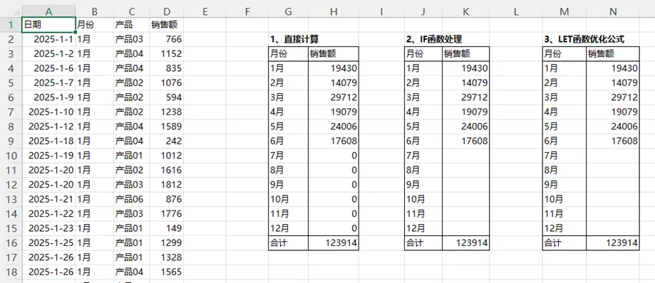 LET 函数是一个非常强大的工具,它允许在单个公式内定义变量(名称),并在公式的后续计算中重复使用这些变量,提高公式的可读性、可维护性和计算效率。•名称1,名称2,……,为变量定义的名称(文本字符串),这些名称要遵循 Excel 名称规则(不能以数字开头,不能包含空格和某些特殊字符,避免使用单元格地址如 A1)。•名称1对应值,名称1对应值,……,与名称1,名称2,……对应的值,可以是常量、单元格引用、表达式,或者之前在同一 LET 函数中定义的变量名(后面的变量可以依赖前面的变量)。•计算表达式,这是公式的最后一部分,是使用前面定义的所有变量进行最终计算并返回结果的表达式,这个表达式的结果就是整个 LET 函数的结果。•顺序依赖:变量是按定义的顺序进行计算的,后面的变量可以引用前面已经定义的变量,但不能引用后面尚未定义的变量。•唯一名称:在同一个 LET 函数内部,每个变量名必须是唯一的。•最终计算:只有计算表达式的结果会被返回并显示在单元格中,中间变量的计算结果仅用于内部计算。•作用域限制:定义的变量仅在该公式内部有效,不能在另一个单元格的公式里直接使用这些变量。再次强调,使用LET函数的出发点是简化在公式中重复出现多次的表达式,消灭重复,并增强公式的计算逻辑阅读性。下图是一个简单的示例,要求依据A列至D列的数据,计算出各月的销售额,在各月统计表中,第一列列示出完整的月份名称。G列至H列第一个表格的公式,是最常见的直接输入SUMIF函数,这样就导致没有数据的月份出现了结果0,表格很不好看,尽管可以设置数字格式隐藏0,但这种处理方法违背了数据处理的规则:没有数据的月份就应该是空单元格,因为从财务角度来说,某些情况下数字0与空单元格的含义是不同的:J列至K列第二个表格的公式,是使用IF函数做判断,将没有数据的月份处理为空值,在这个公式中,SUMIF表达式被使用了两次,使得公式显得冗长:=IF(SUMIF(B:B,G4,D:D)=0,"",SUMIF(B:B,G4,D:D))M列至N列第三个表格的公式,则是使用LET函数来处理重复的SUMIF表达式,使公式简单易懂,精炼易读:=LET(x,SUMIF(B:B,M4,D:D),IF(x=0,"",x))这个公式中,就是定义了一个名称“x”,其值为SUMIF(B:B,M4,D:D),因此在LET函数的最后一个计算表达式中,直接使用这个名称“x”进行判断处理,而这个x只计算了一次,避免了重复计算。
