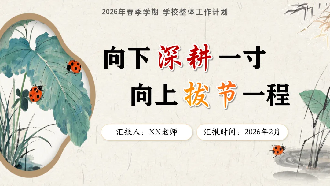 今天分享的是2026年春季学校整体工作计划的ppt课件及配套的发言稿,主题是《向下深耕一寸,向上拔节一程》。2026年春季学校整体工作计划逐字发言稿
