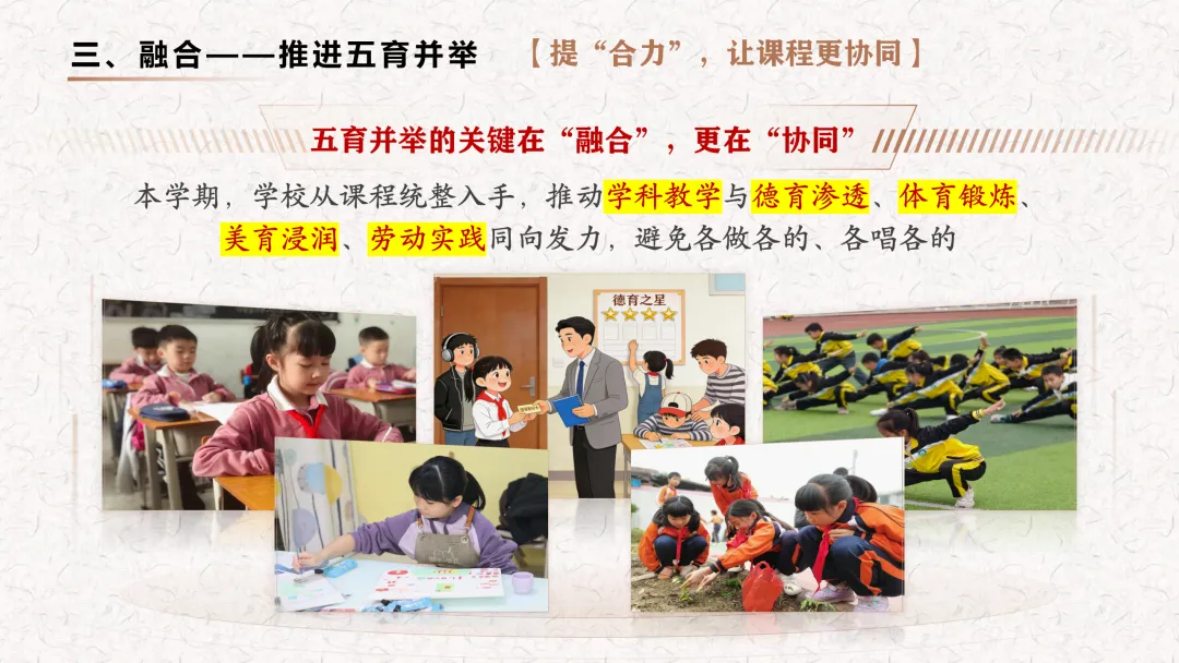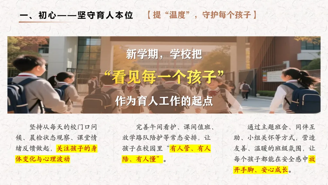我们本次的汇报将围绕六个关键词展开:初心、专注、融合、规范、协同、前瞻。这六个关键词不仅是我们本学期工作的核心指导思想,更是我们实现学校稳步发展、学生全面成长的重要保障。