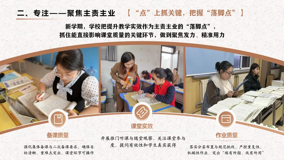 接下来,我们来看第二个关键词:专注。教学是学校的主责主业,是学校发展的核心。新学期,学校把提升教学实效作为主责主业的“落脚点”,抓住能直接影响课堂质量的关键环节,做到聚焦发力、精准用力。