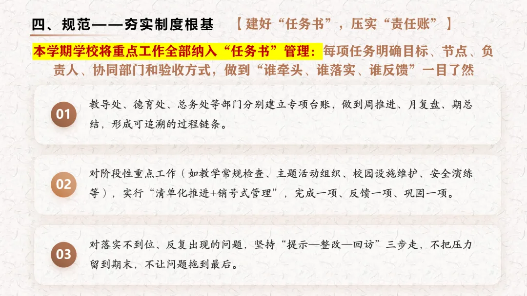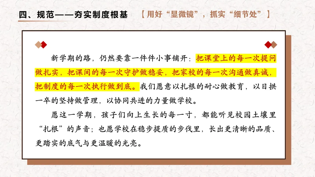 新学期的路,仍然要靠一件件小事铺开:把课堂上的每一次提问做扎实,把课间的每一次守护做稳妥,把家校的每一次沟通做真诚,把制度的每一次执行做到底。我们愿意以扎根的耐心做教育,以日拱一卒的坚持做管理,以协同共进的力量做学校。