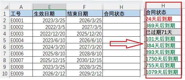 要求:根据合同到期日期,自动计算出还剩下多少天,并将结果显示在表格的H列。另外,要根据剩余天数的不同,进行差异化标记: