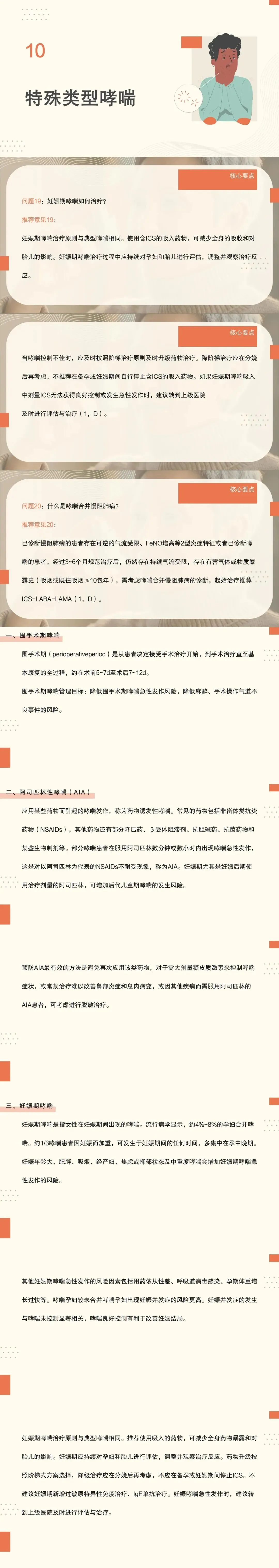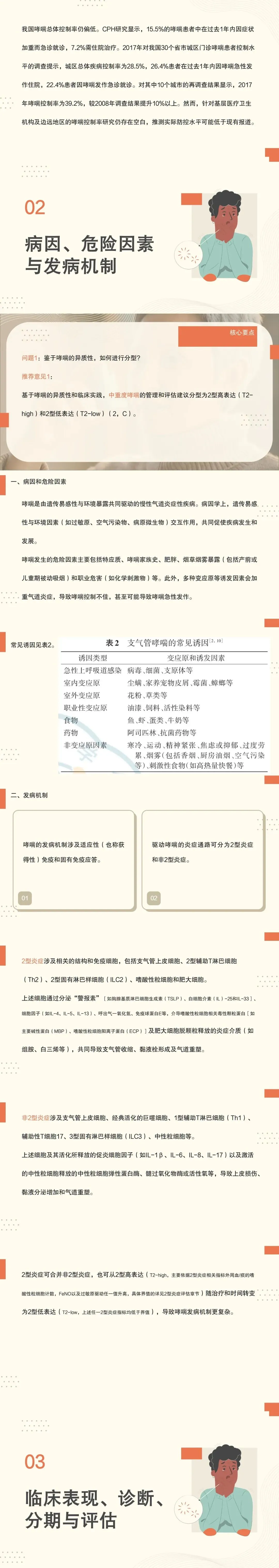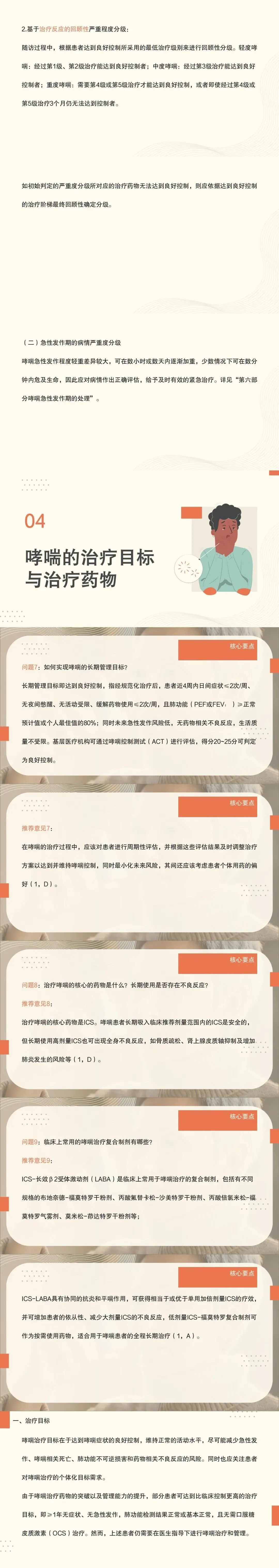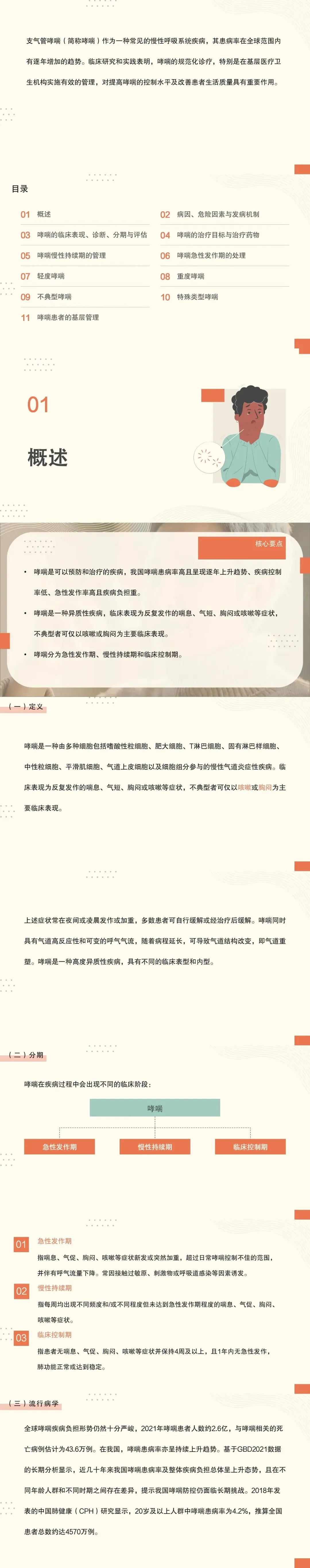 - 系统梳理哮喘的病因、危险因素与发病机制、临床表现、诊断、分期与评估、哮喘的治疗目标与治疗药物等内容;